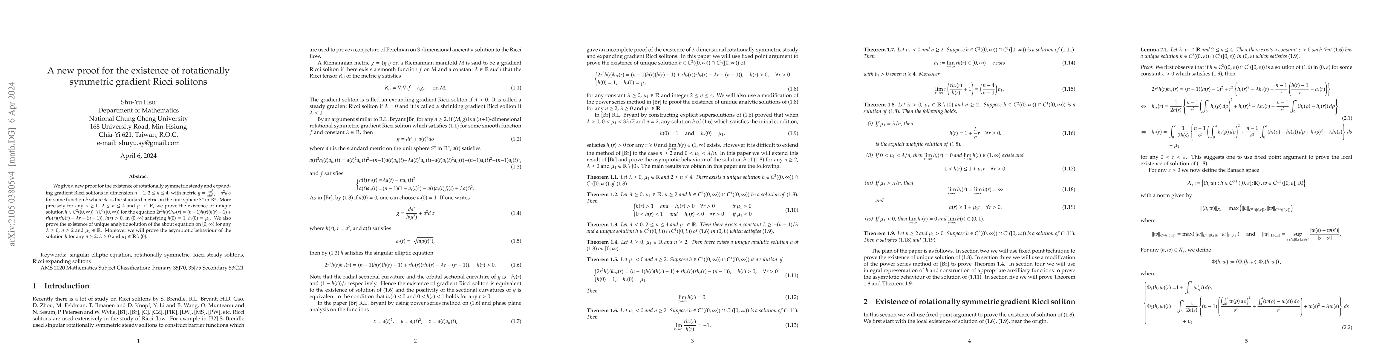 We give a new proof for the existence of rotationally symmetric steady and expanding gradient Ricci solitons in dimension $n+1$, $2\le n\le 4$, with metric $g=\frac{da^2}{h(a^2)}+a^2d\,\sigma$ for some function $h$ where $d\sigma$ is the standard metric on the unit sphere $S^n$ in $\mathbb{R}^n$. More precisely for any $\lambda\ge 0$, $2\le n\le 4$ and $\mu_1\in\mathbb{R}$, we prove the existence of unique solution $h\in C^2((0,\infty))\cap C^1([0,\infty))$ for the equation $2r^2h(r)h_{rr}(r)=(n-1)h(r)(h(r)-1)+rh_r(r)(rh_r(r)-\lambda r-(n-1))$, $h(r)>0$, in $(0,\infty)$ satisfying $h(0)=1$, $h_r(0)=\mu_1$. We also prove the existence of unique analytic solution of the about equation on $[0,\infty)$ for any $\lambda\ge 0$, $n\ge 2$ and $\mu_1\in\mathbb{R}$. Moreover we will prove the asymptotic behaviour of the solution $h$ for any $n\ge 2$, $\lambda\ge 0$ and $\mu_1\in\mathbb{R}\setminus\{0\}$.