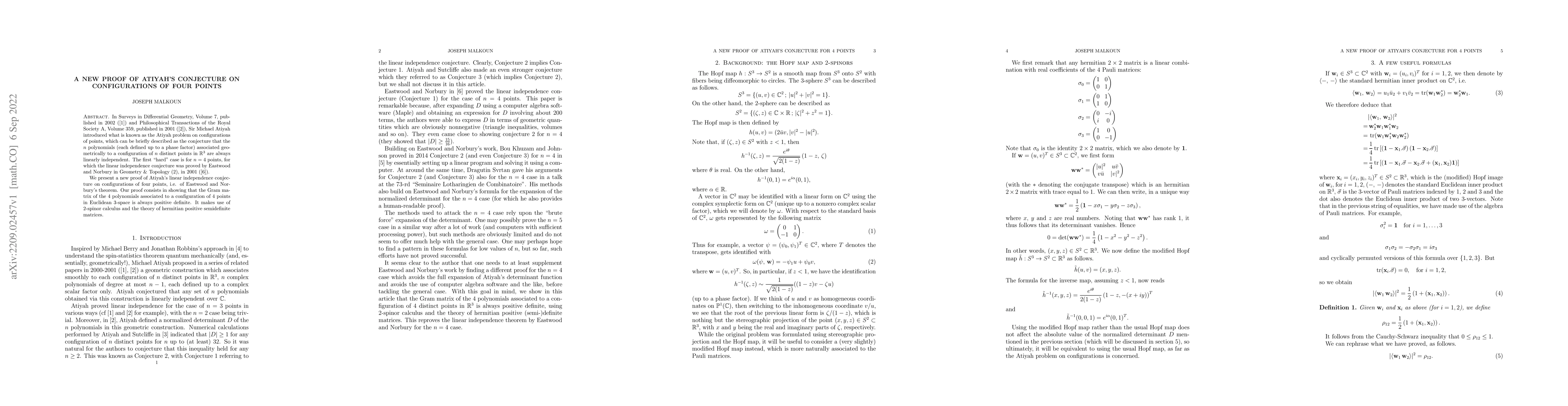 This paper presents a new proof for Atiyah's conjecture on the linear independence of polynomials associated with four points in $\mathbb{R}^3$. The proof demonstrates the positive definiteness of the Gram matrix of these polynomials using $2$-spinor calculus and Hermitian positive semidefinite matrices.