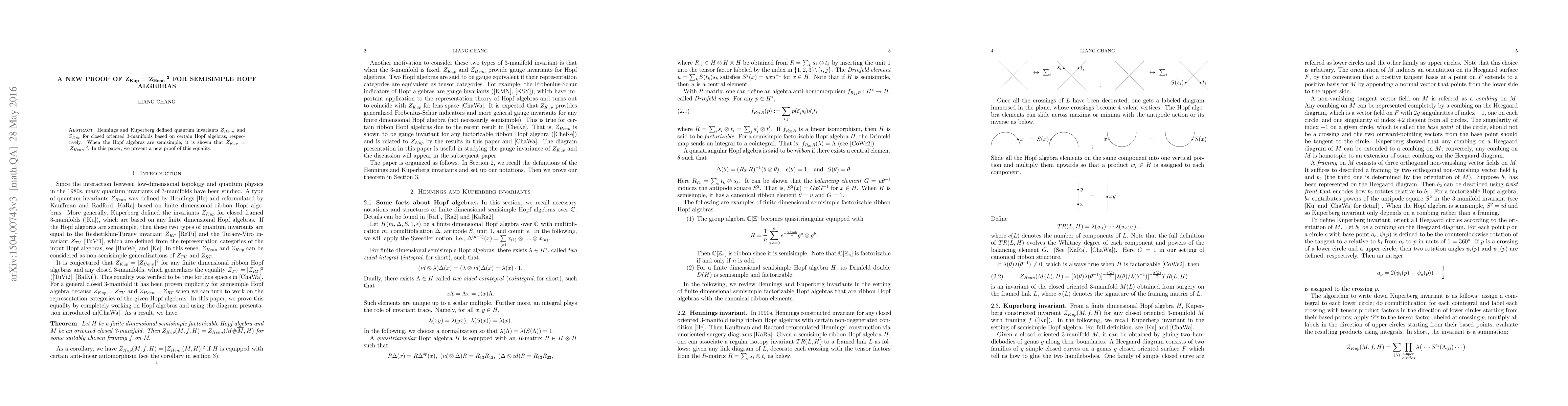 Hennings and Kuperberg defined quantum invariants $Z_{Henn}$ and $Z_{Kup}$ for closed oriented $3$-manifolds based on certain Hopf algebras, respectively. When the Hopf algebras are semisimple, it is shown that $Z_{Kup}=|Z_{Henn}|^2$. In this paper, we present a new proof of this equality.