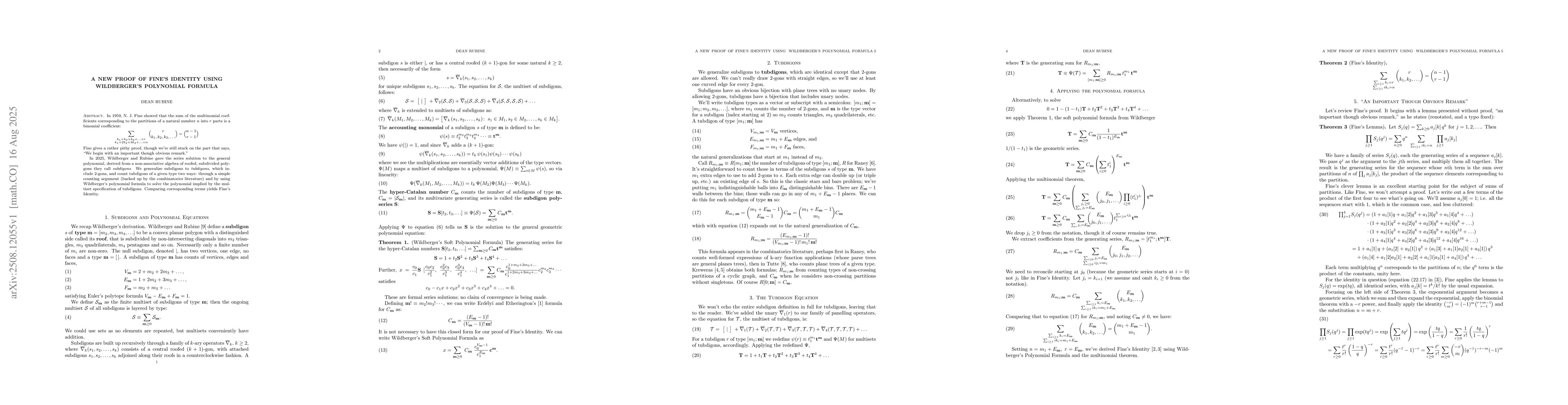 In 1959, N. J. Fine showed that the sum of the multinomial coefficients corresponding to the partitions of a natural number $n$ into $r$ parts is a binomial coefficient: $$ \sum_{\substack{k_1 + k_2 + k_3 + {}\ldots = r \\ k_1 + 2k_2 + 3k_3 + {}\ldots = n }} \binom{r}{k_1, k_2, k_3, \ldots } = \binom{n - 1}{r - 1} $$ Fine gives a rather pithy proof, though we're still stuck on the part that says, ``We begin with an important though obvious remark.'' In 2025, Wildberger and Rubine gave the series solution to the general polynomial, derived from a non-associative algebra of roofed, subdivided polygons they call \textit{subdigons}. We generalize subdigons to \textit{tubdigons}, which include 2-gons, and count tubdigons of a given type two ways: through a simple counting argument (backed up by the combinatorics literature) and by using Wildberger's polynomial formula to solve the polynomial implied by the multiset specification of tubdigons. Comparing corresponding terms yields Fine's Identity.