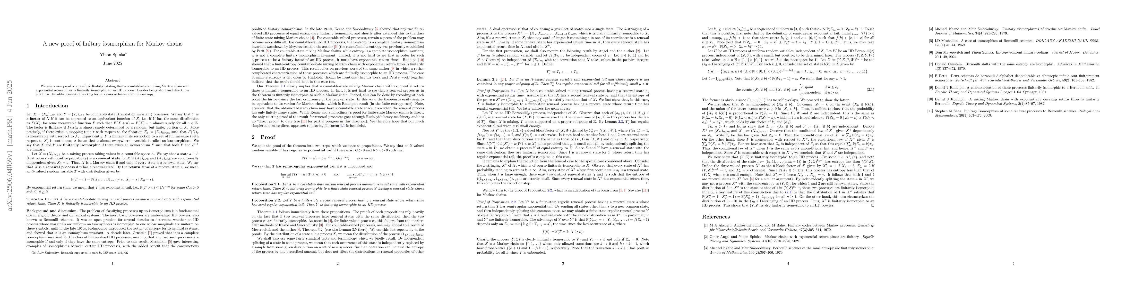 The paper presents an innovative, simplified proof for the finitary isomorphism of Markov chains with exponential return times, applicable to processes of varying entropy.