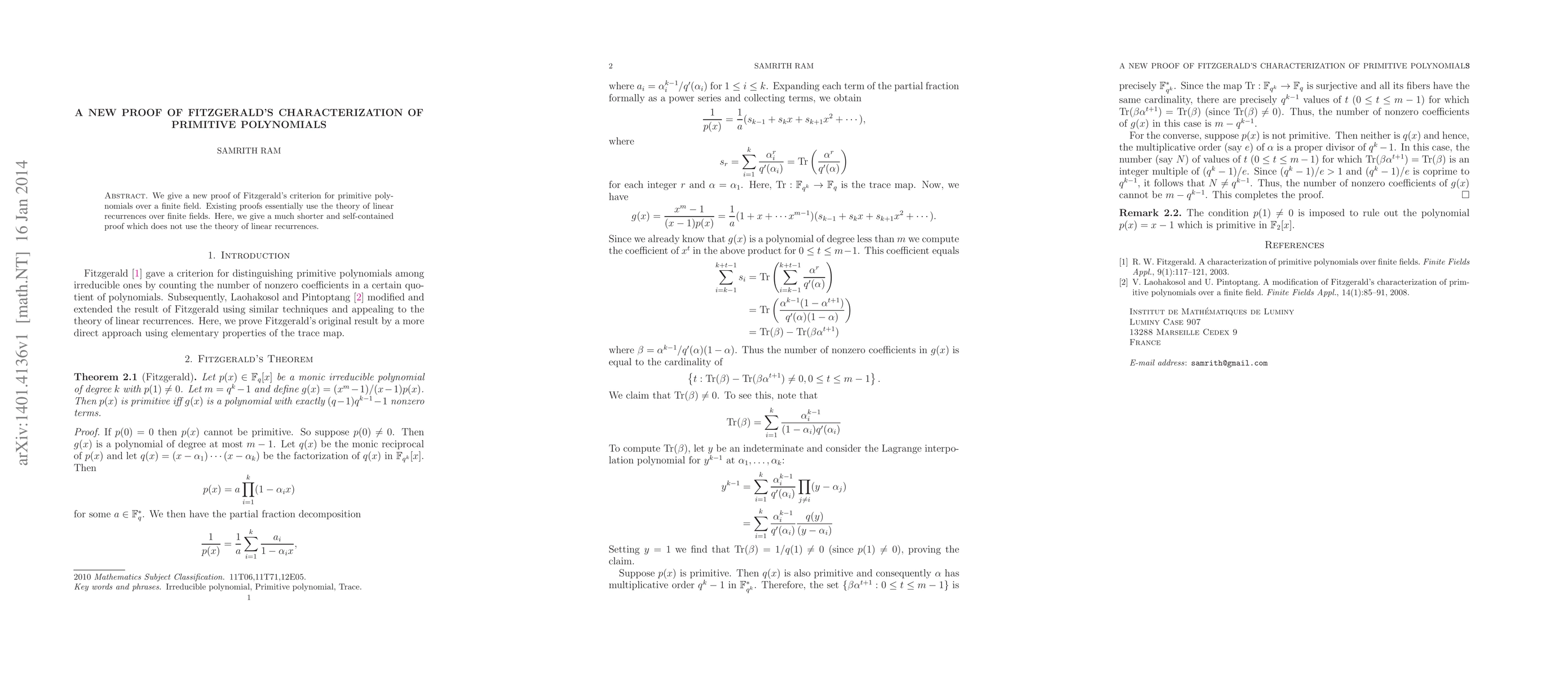 We give a new proof of Fitzgerald's criterion for primitive polynomials over a finite field. Existing proofs essentially use the theory of linear recurrences over finite fields. Here, we give a much shorter and self-contained proof which does not use the theory of linear recurrences.