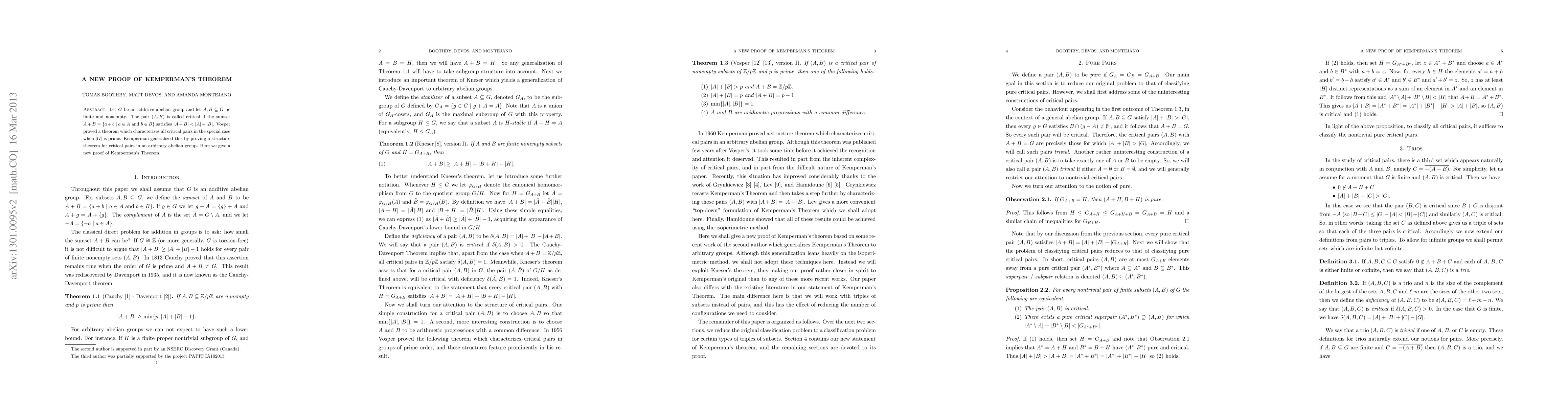 Let $G$ be an additive abelian group and let $A,B \subseteq G$ be finite and nonempty. The pair $(A,B)$ is called critical if the sumset $A+B = {a+b \mid $a \in A$ and $b\in B$}$ satisfies $|A+B| < |A| + |B|$. Vosper proved a theorem which characterizes all critical pairs in the special case when $|G|$ is prime. Kemperman generalized this by proving a structure theorem for critical pairs in an arbitrary abelian group. Here we give a new proof of Kemperman's Theorem.