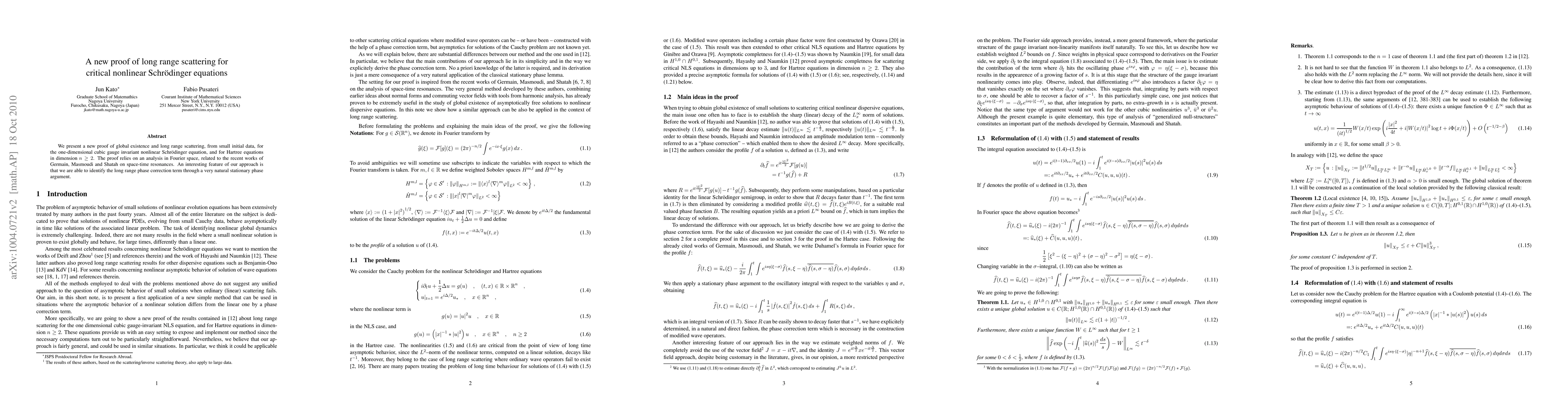 This paper provides a new proof for global existence and long range scattering of small initial data for one-dimensional cubic nonlinear Schrödinger equations and Hartree equations in higher dimensions. The proof utilizes Fourier space analysis and a stationary phase argument to identify the long range phase correction term.