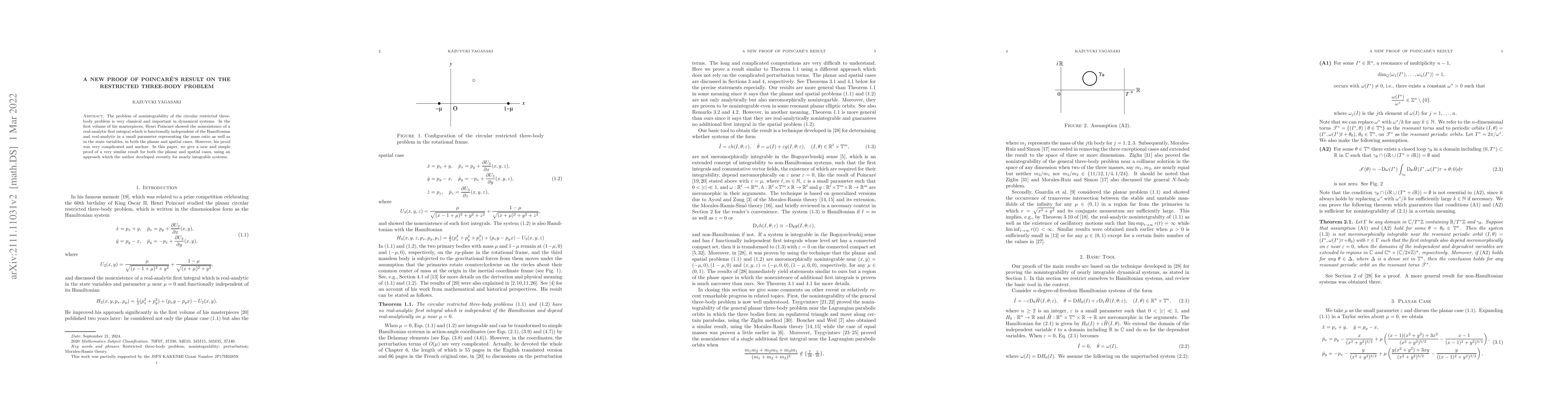 This paper presents a new, simplified proof of Poincar\'e's classical result on the nonintegrability of the restricted three-body problem, utilizing a recently developed approach for nearly integrable systems. The proof clarifies the original complicated and unclear demonstration by Henri Poincar\'e.