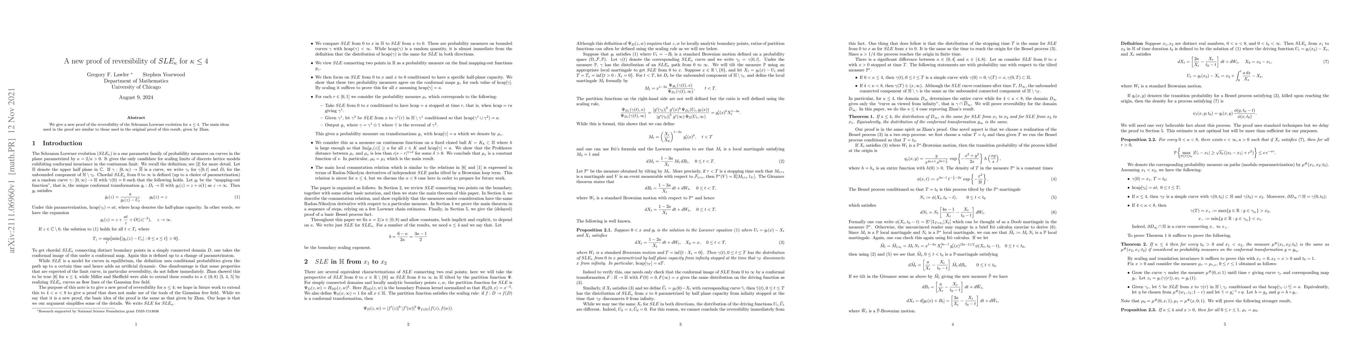 We give a new proof of the reversibility of the Schramm Loewner evolution for $\kappa \leq 4$. The main ideas used in the proof are similar to those used in the original proof of this result, given by Zhan.