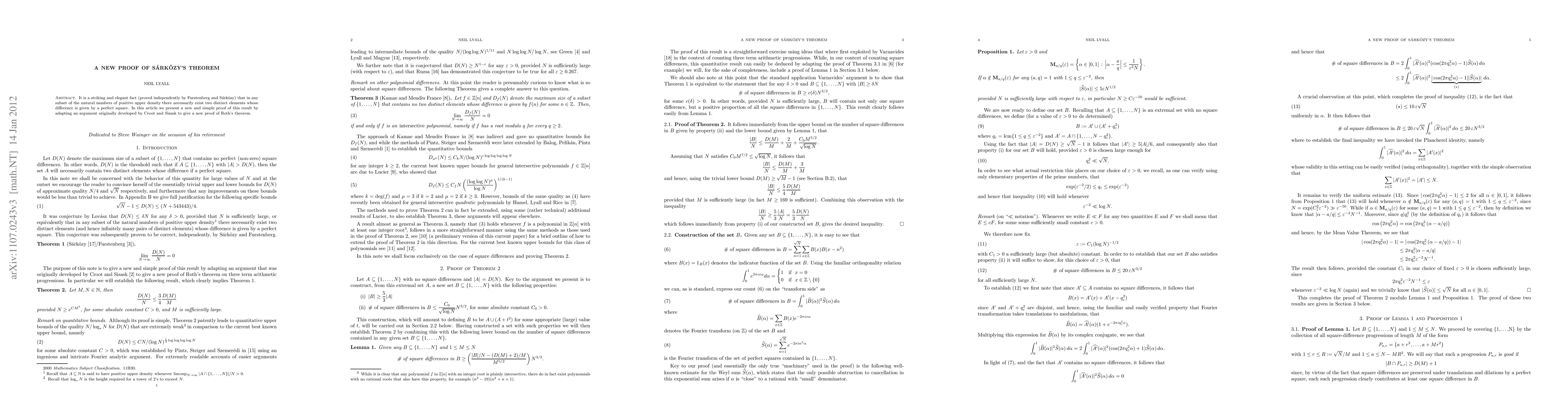 Researchers provide a new proof of Sarkozy's theorem, proving that in any subset of natural numbers with positive upper density, there exist two distinct elements whose difference is a perfect square.