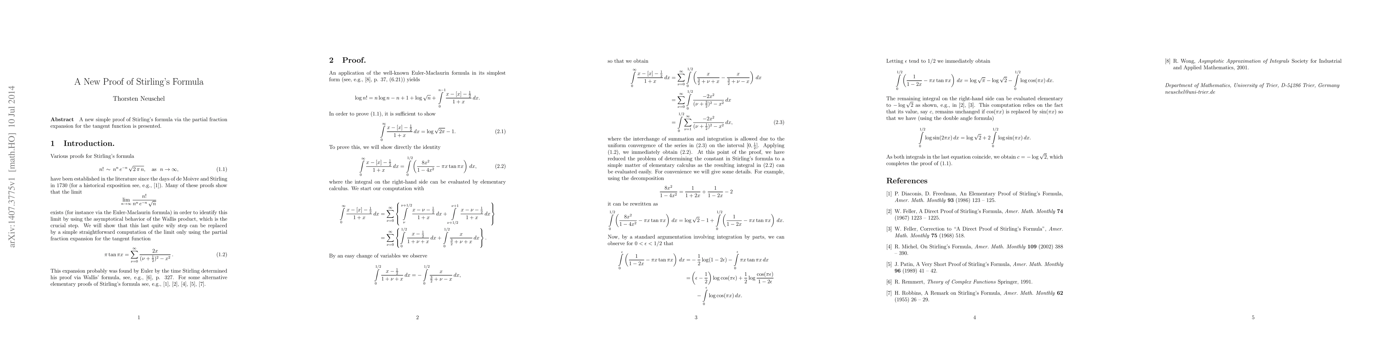 Summary: This paper introduces a straightforward proof of Stirling's formula utilizing the partial fraction expansion of the tangent function. The method provides an elegant alternative to traditional derivations.