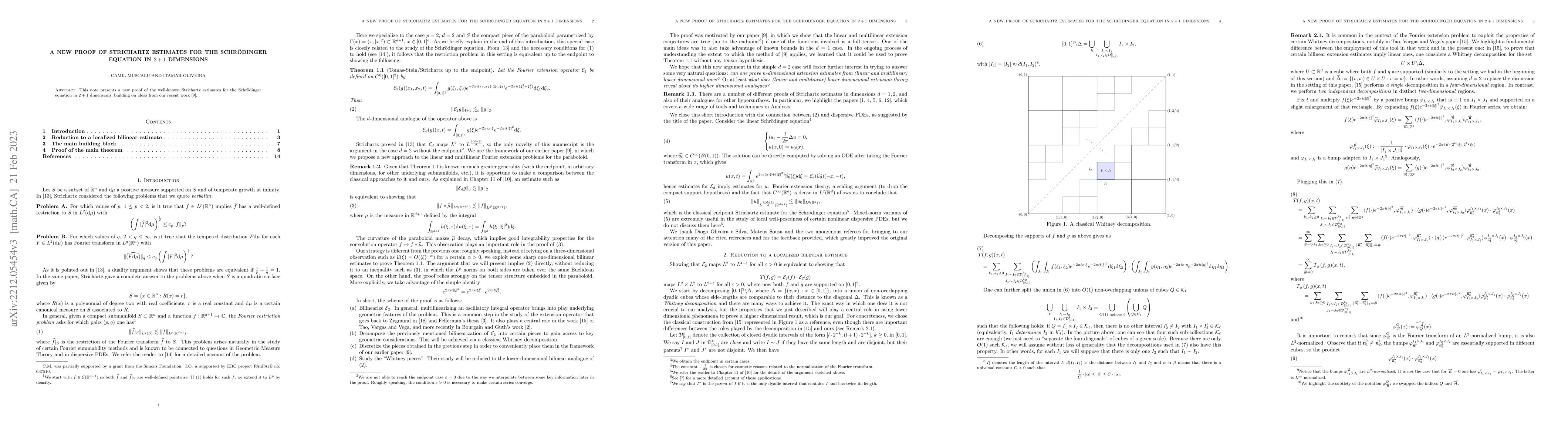 Summary: This paper introduces a novel proof for the Strichartz estimates applicable to the Schrödinger equation in $2+1$ dimensions, leveraging insights from the authors' previous work. The new approach aims to provide a more streamlined and intuitive understanding of the estimates.