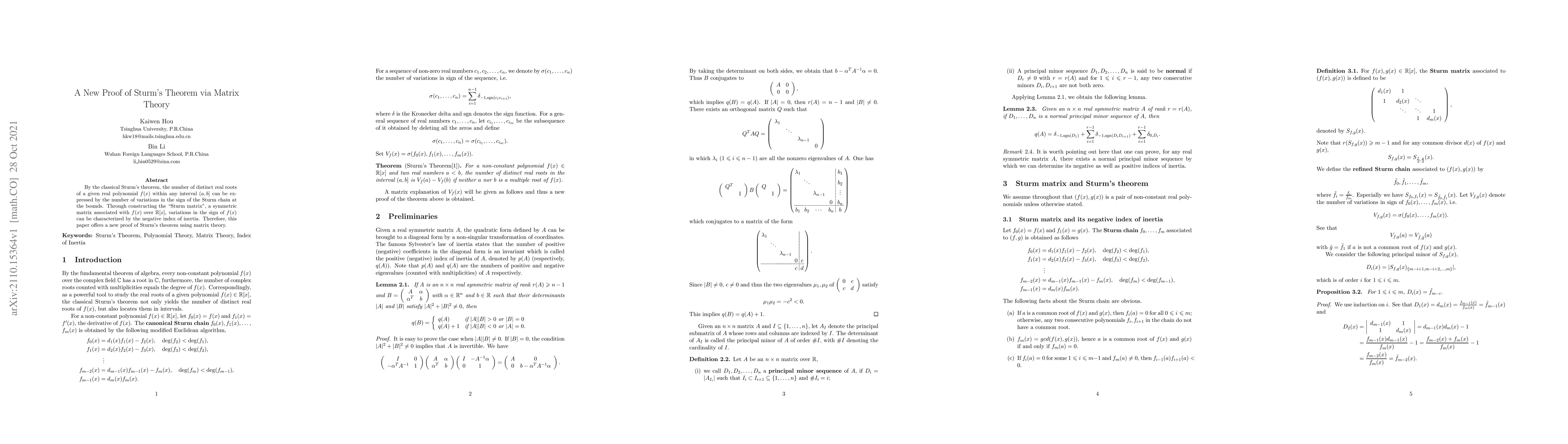 This paper presents a novel proof of Sturm's theorem using matrix theory by constructing a "Sturm matrix" associated with a polynomial, demonstrating that the number of distinct real roots within an interval corresponds to the negative index of inertia of this matrix.