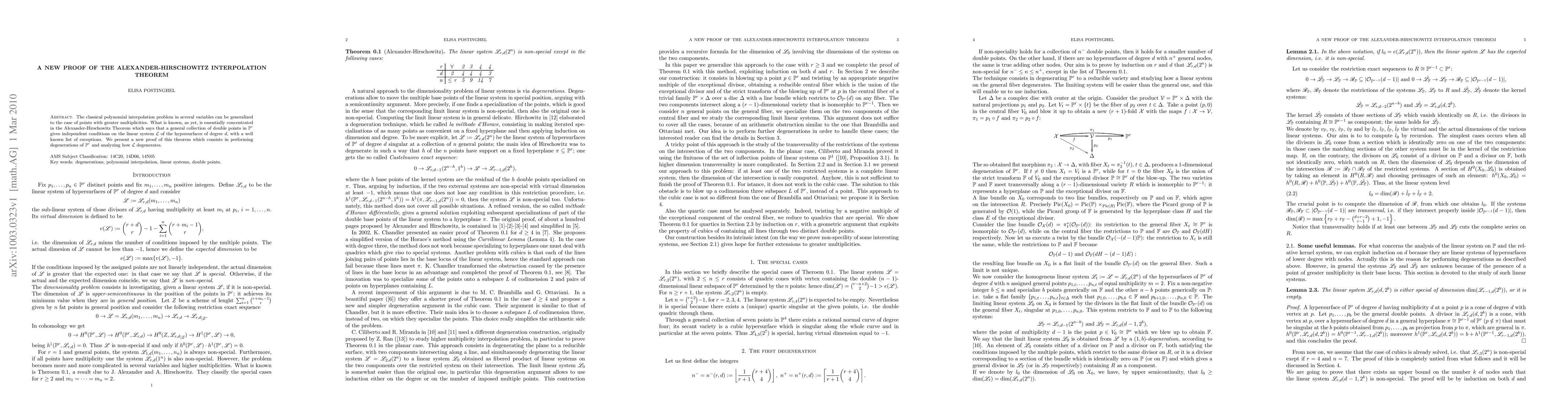 The classical polynomial interpolation problem in several variables can be generalized to the case of points with greater multiplicities. What is known, as yet, is essentially concentrated in the Alexander-Hirschowitz Theorem which says that a general collection of double points in P^r gives independent conditions on the linear system L of the hypersurfaces of degree d, with a well known list of exceptions. We present a new proof of this theorem which consists in performing degenerations of P^r and analyzing how L degenerates.