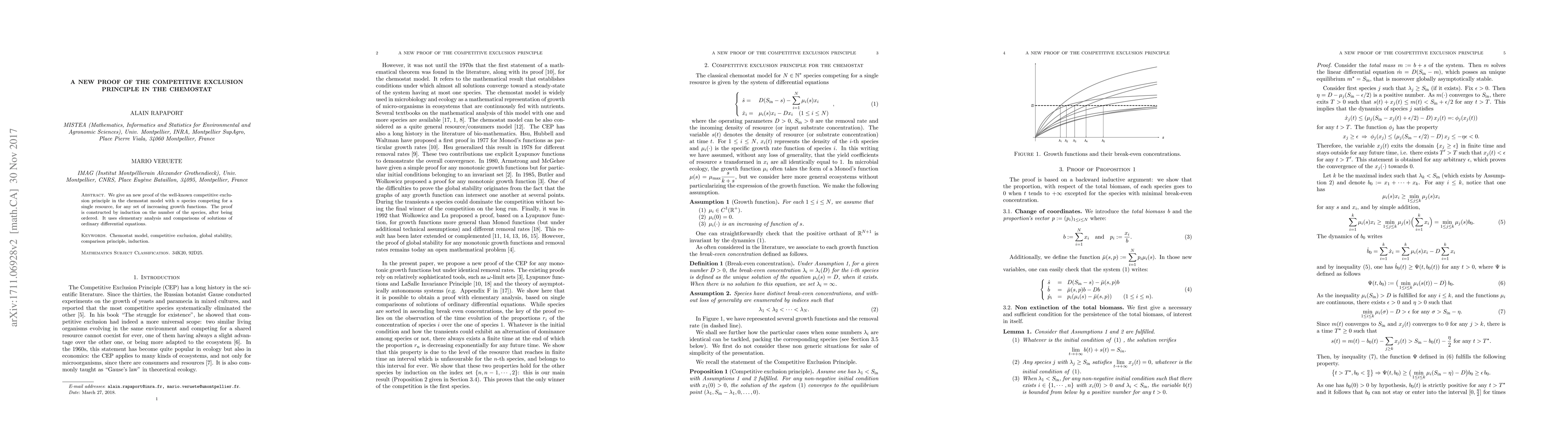 The proof is constructed by induction on the number of species, showing that any set of increasing growth functions will lead to the exclusion of one or more species.