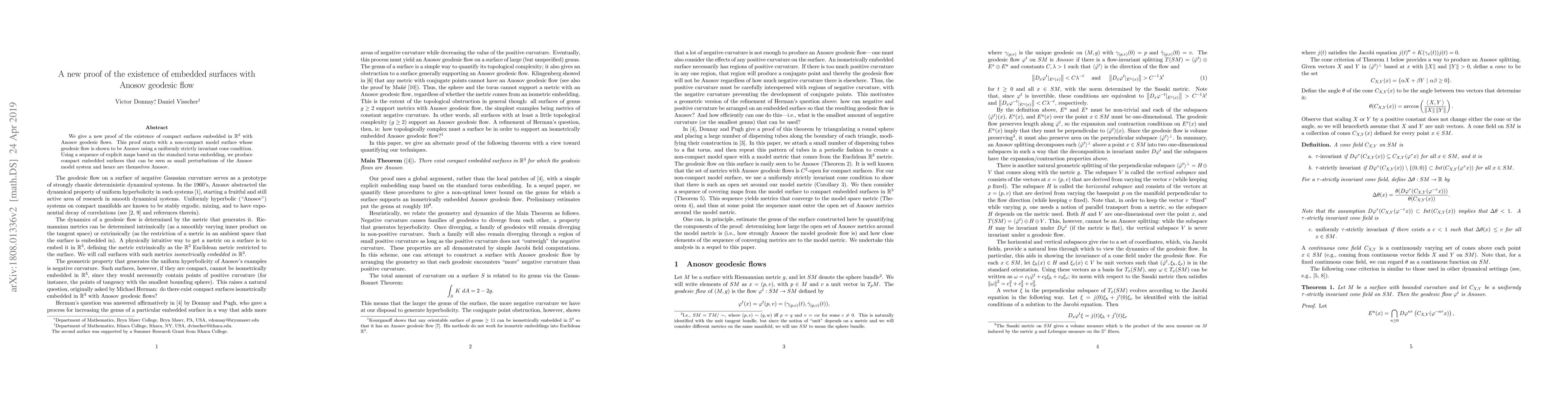 We give a new proof of the existence of compact surfaces embedded in $R^3$ with Anosov geodesic flows. This proof starts with a non-compact model surface whose geodesic flow is shown to be Anosov using a uniformly strictly invariant cone condition. Using a sequence of explicit maps based on the standard torus embedding, we produce compact embedded surfaces that can be seen as small perturbations of the Anosov model system and hence are themselves Anosov.