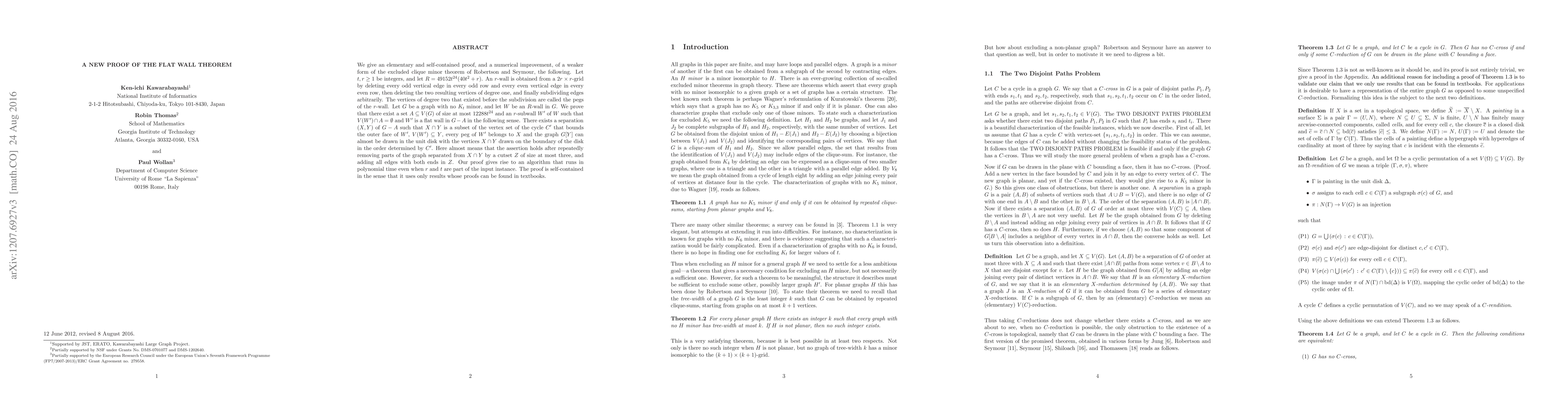 We give an elementary and self-contained proof, and a numerical improvement, of a weaker form of the excluded clique minor theorem of Robertson and Seymour, the following. Let t,r>0 be integers, and let R=49152t^{24}(40t^2+r). An r-wall is obtained from a (2r x r)-grid by deleting every odd vertical edge in every odd row and every even vertical edge in every even row, then deleting the two resulting vertices of degree one, and finally subdividing edges arbitrarily. The vertices of degree two that existed before the subdivision are called the pegs of the r-wall. Let G be a graph with no K_t minor, and let W be an R-wall in G. We prove that there exist a subset A of V(G) of size at most 12288t^{24} and an r-subwall W' of W such that V(W') is disjoint from A and W' is a flat wall in G-A in the following sense. There exists a separation (X,Y) of G-A such that X\cap Y is a subset of the vertex set of the cycle C' that bounds the outer face of W', V(W') is a subset of Y, every peg of W' belongs to X and the graph G[Y] can almost be drawn in the unit disk with the vertices X\cap Y drawn on the boundary of the disk in the order determined by C'. Here almost means that the assertion holds after repeatedly removing parts of the graph separated from X\cap Y by a cutset Z of size at most three, and adding all edges with both ends in Z. Our proof gives rise to an algorithm that runs in polynomial time even when r and t are part of the input instance. The proof is self-contained in the sense that it uses only results whose proofs can be found in textbooks.