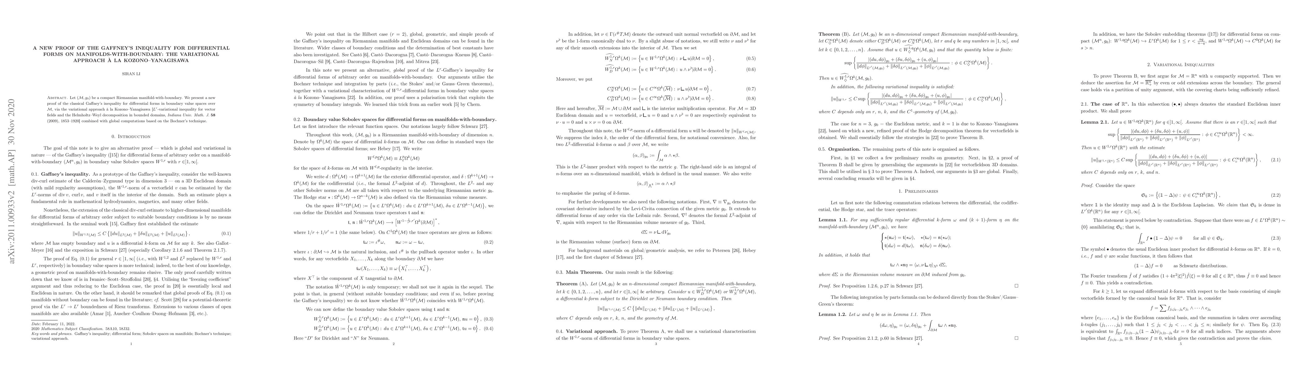Let $(\mathcal{M},g_0)$ be a compact Riemannian manifold-with-boundary. We present a new proof of the classical Gaffney's inequality for differential forms in boundary value spaces over $\mathcal{M}$, via the variational approach \`{a} la Kozono--Yanagisawa [$L^r$-variational inequality for vector fields and the Helmholtz--Weyl decomposition in bounded domains, Indiana Univ. Math. J. 58 (2009), 1853--1920] combined with global computations based on the Bochner's technique.