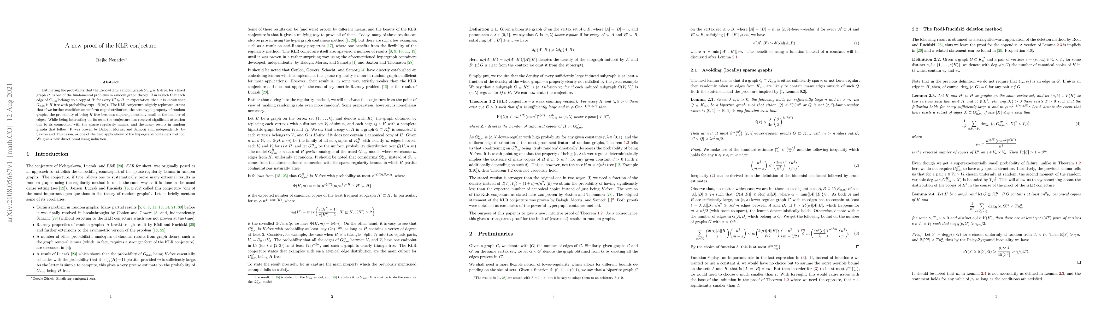 Estimating the probability that the Erd\H{o}s-R\'enyi random graph $G(n,m)$ is $H$-free, for a fixed graph $H$, is one of the fundamental problems in random graph theory. If $m$ is such that each edge of $G(n,m)$ belongs to a copy of $H'$ for every $H' \subseteq H$, in expectation, then it is known that $G(n,m)$ is $H$-free with probability $\exp(- \Theta(m))$. The KLR conjecture, slightly rephrased, states that if we further condition on uniform edge distribution, the archetypal property of random graphs, the probability of being $H$-free becomes superexponentially small in the number of edges. While being interesting on its own, the conjecture has received significant attention due to its connection with the sparse regularity lemma, and the many results in random graphs that follow. It was proven by Balogh, Morris, and Samotij and, independently, by Saxton and Thomason, as one of the first applications of the hypergraph containers method. We give a new direct proof using induction.