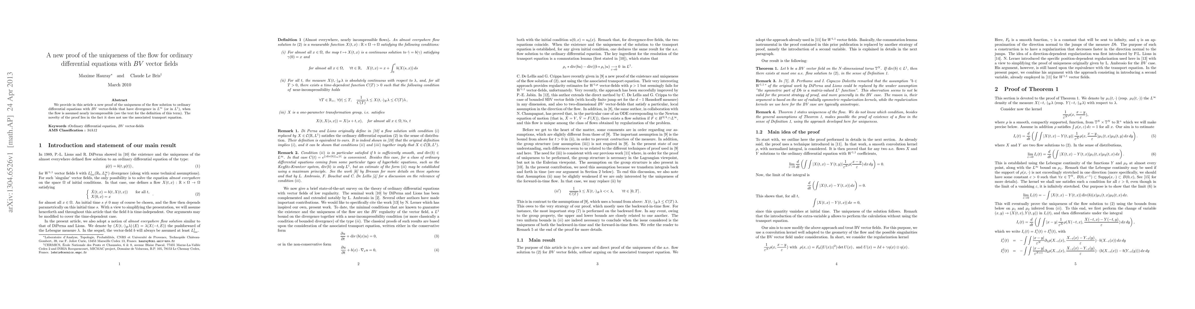Researchers provide a new proof for the uniqueness of flow solutions to ordinary differential equations with certain vector fields, without using traditional methods like the transport equation.