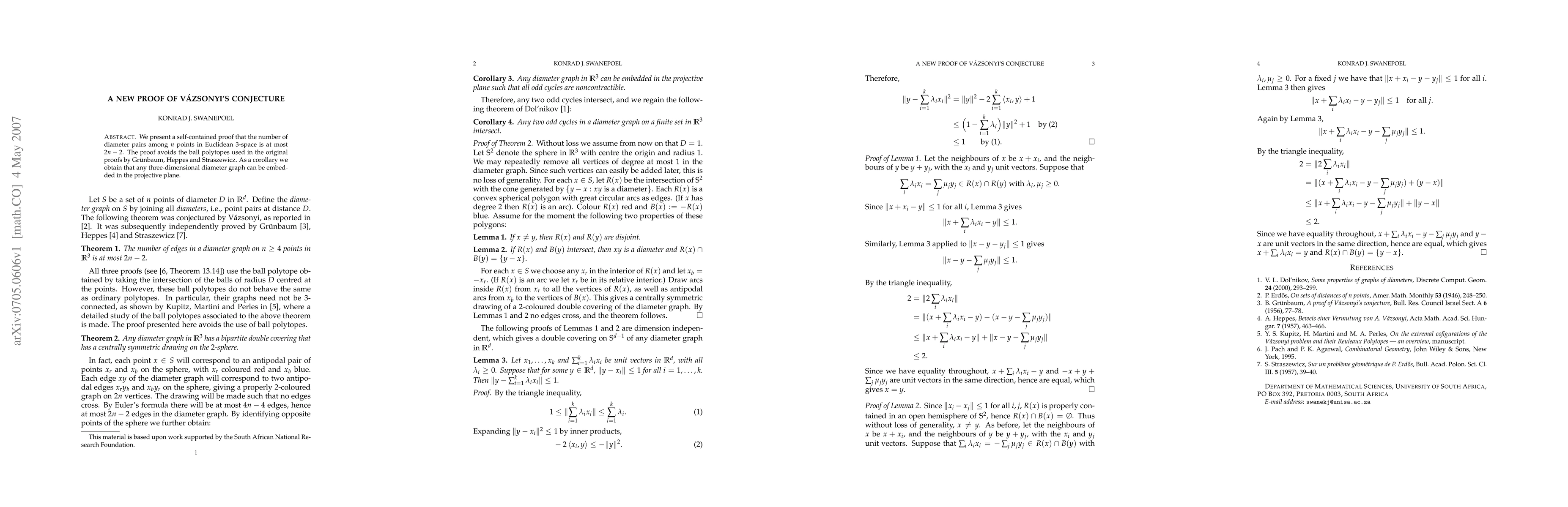 Researchers prove Vazsonyi's conjecture that the number of diameter pairs among n points in 3D space is at most 2n-2, with implications for embedding 3D graphs in projective planes.