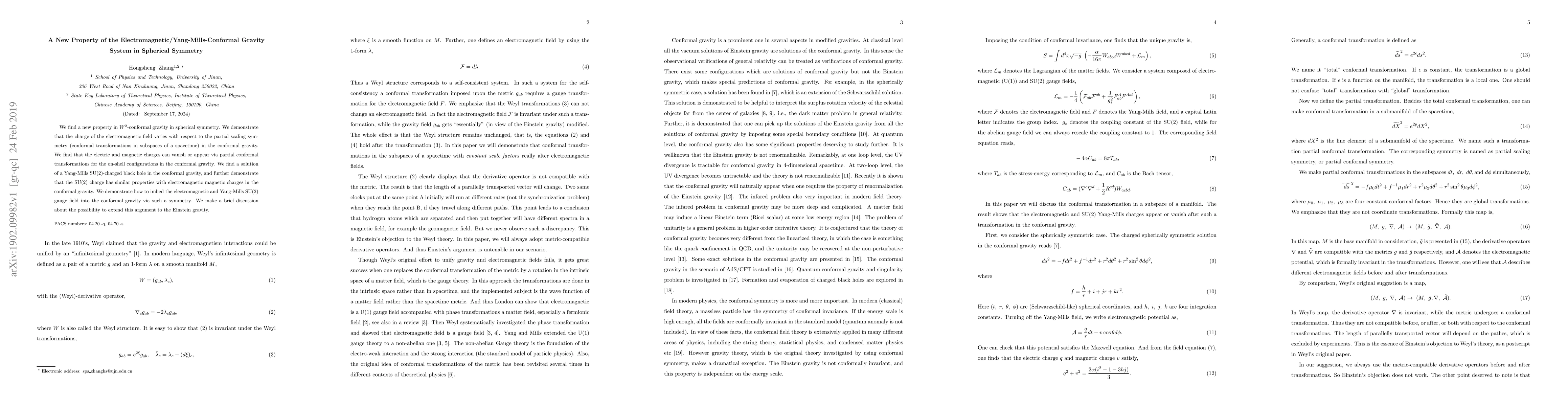 The paper identifies a novel property in $W^2$-conformal gravity under spherical symmetry, where electromagnetic field charges can vary through partial conformal transformations. It also presents a solution for an SU(2)-charged black hole and discusses embedding electromagnetic and Yang-Mills SU(2) gauge fields into conformal gravity, hinting at potential extensions to Einstein gravity.