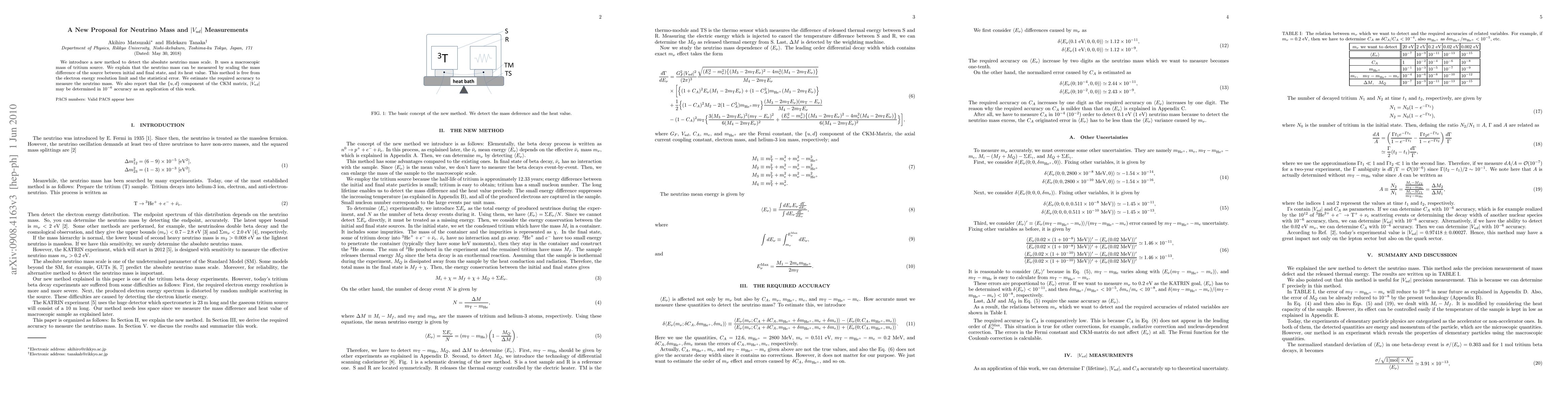 We introduce a new method to detect the absolute neutrino mass scale. It uses a macroscopic mass of tritium source. We explain that the neutrino mass can be measured by scaling the mass difference of the source between initial and final state, and its heat value. This method is free from the electron energy resolution limit and the statistical error. We estimate the required accuracy to measure the neutrino mass. We also report that the {u,d} component of the CKM matrix, |V(ud)| may be determined in 10^-6 accuracy as an application of this work.