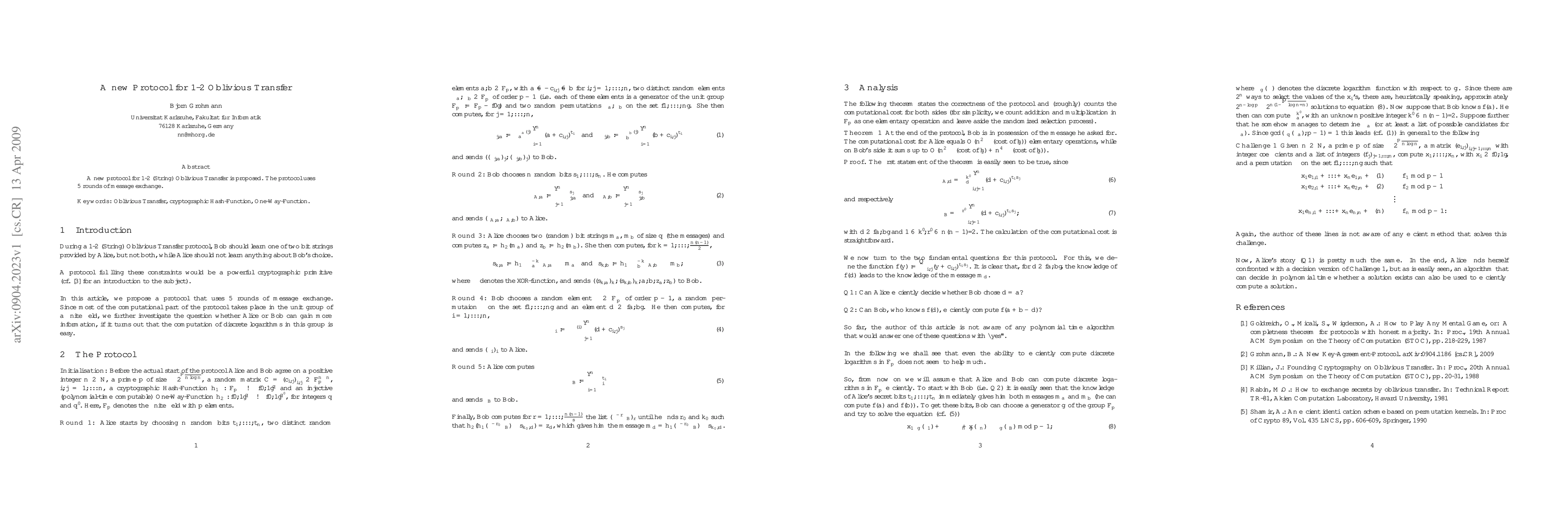 Summary: This paper introduces a novel 1-2 Oblivious Transfer protocol that requires 5 rounds of message exchange, enhancing the security and efficiency of data transfer processes.