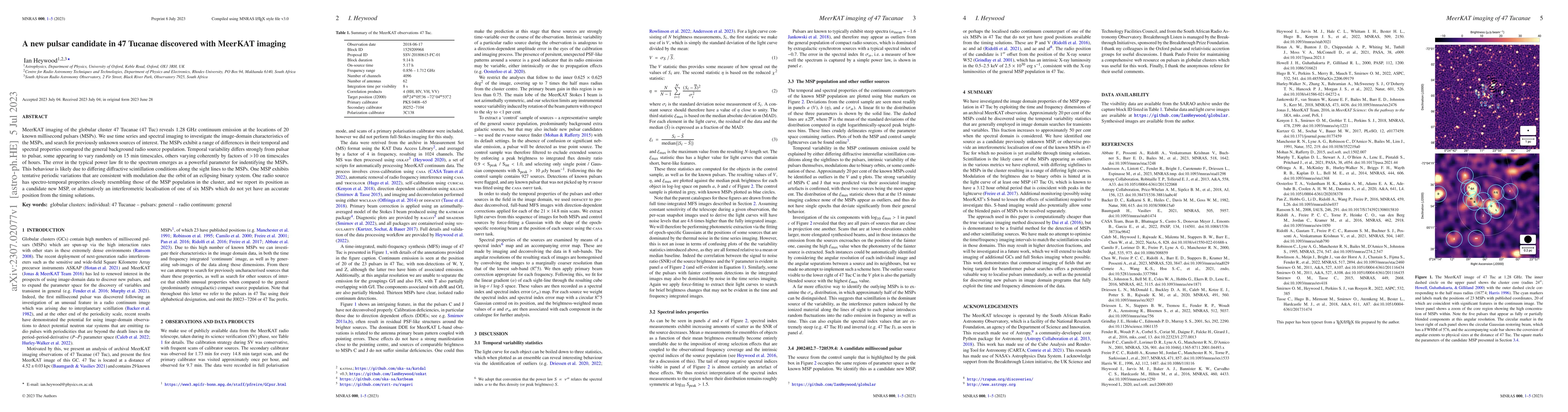 Title: A new pulsar candidate in 47 Tucanae discovered with MeerKAT imaging Summary: MeerKAT imaging of 47 Tucanae identifies a new pulsar candidate among 20 known millisecond pulsars, revealing significant variability in temporal and spectral properties, and suggesting diffractive scintillation effects.