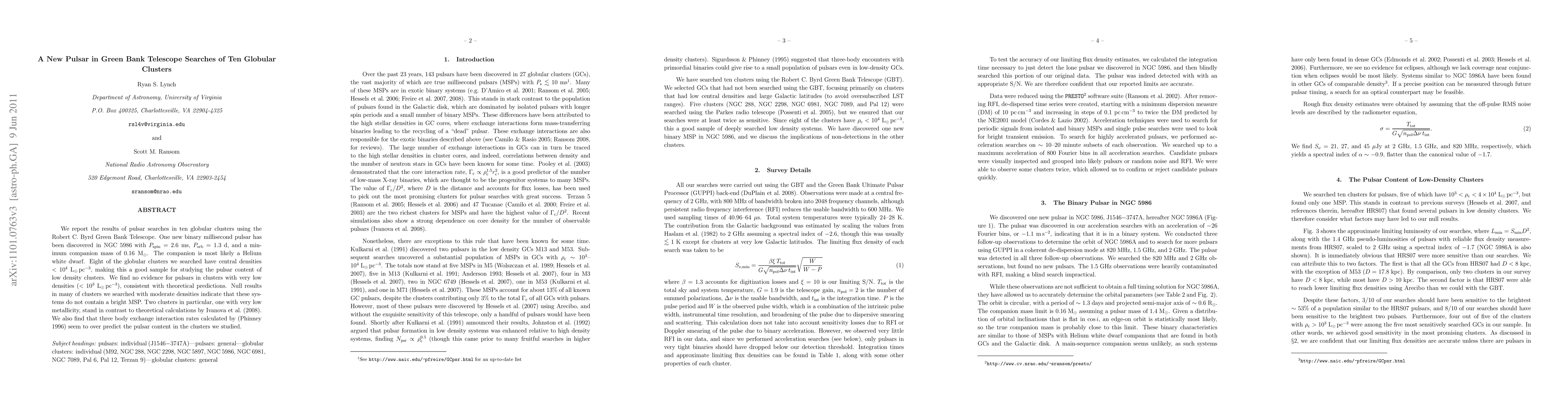 This paper reports the discovery of a new binary millisecond pulsar in NGC 5986 using the Green Bank Telescope, revealing no pulsars in low-density globular clusters and suggesting discrepancies between observed pulsar content and theoretical predictions.