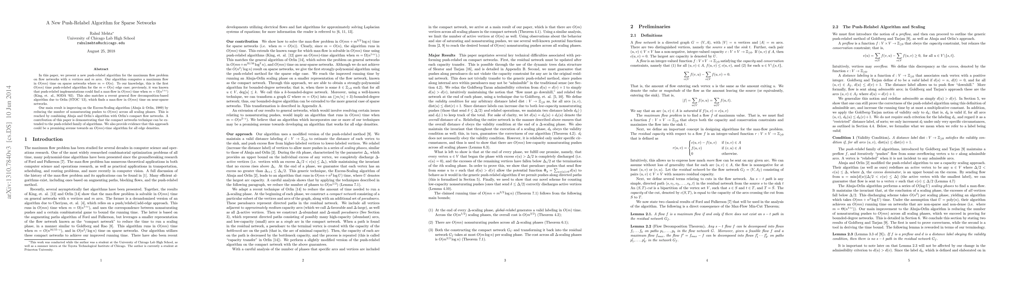 This paper introduces a new push-relabel algorithm achieving $O(mn)$ time complexity for maximum flow in sparse networks ($m = O(n)$), improving upon previous methods that required $m = \Omega(n^{1+\epsilon})$. It combines Ahuja and Orlin's Excess-Scaling algorithm with Orlin's compact flow networks to reduce nonsaturating pushes to $O(mn)$.