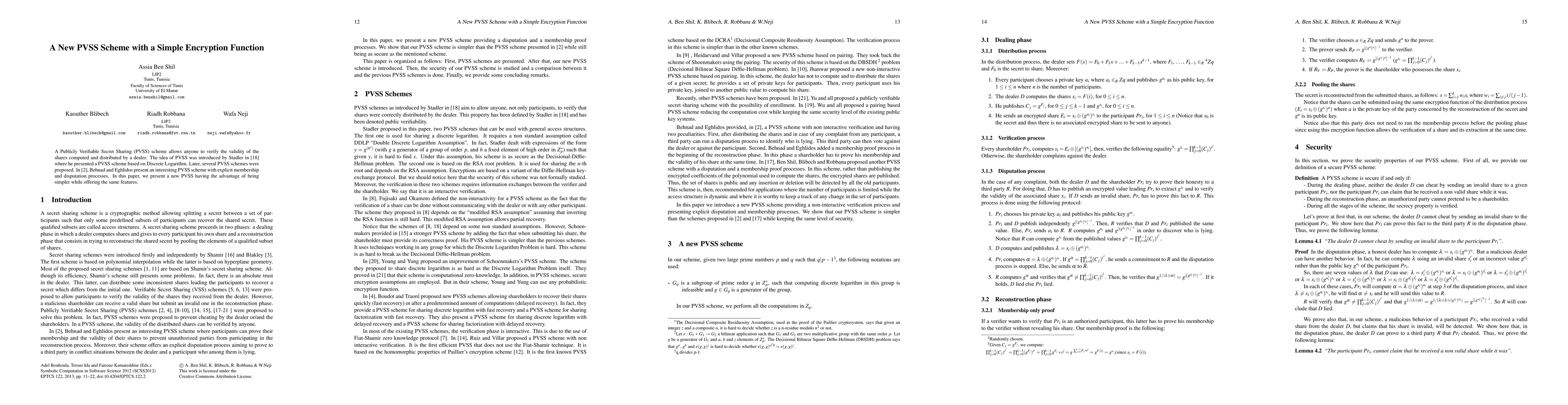 A Publicly Verifiable Secret Sharing (PVSS) scheme allows anyone to verify the validity of the shares computed and distributed by a dealer. The idea of PVSS was introduced by Stadler in [18] where he presented a PVSS scheme based on Discrete Logarithm. Later, several PVSS schemes were proposed. In [2], Behnad and Eghlidos present an interesting PVSS scheme with explicit membership and disputation processes. In this paper, we present a new PVSS having the advantage of being simpler while offering the same features.