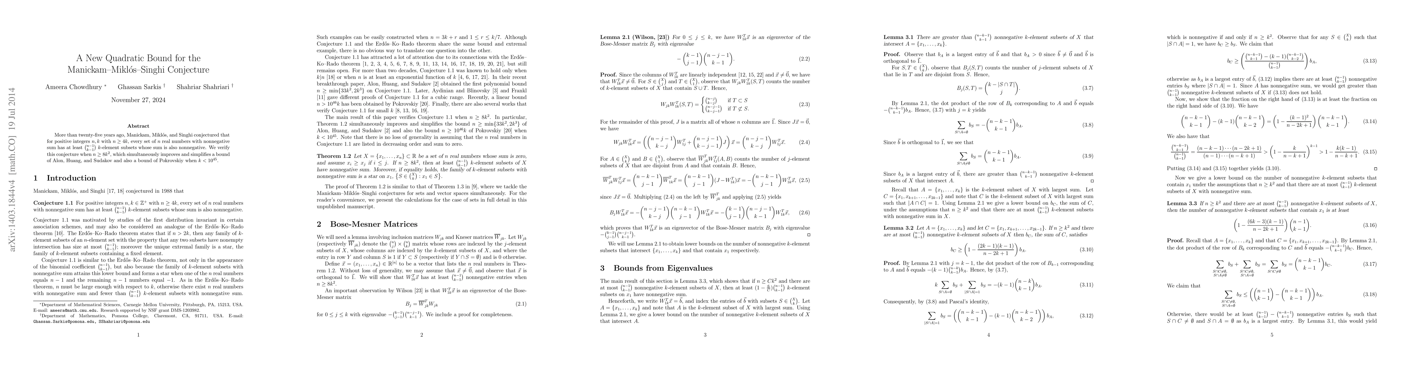 More than twenty-five years ago, Manickam, Miklos, and Singhi conjectured that for positive integers $n,k$ with $n \geq 4k$, every set of $n$ real numbers with nonnegative sum has at least $\binom{n-1}{k-1}$ $k$-element subsets whose sum is also nonnegative. We verify this conjecture when $n \geq 8k^2$, which simultaneously improves and simplifies a bound of Alon, Huang, and Sudakov and also a bound of Pokrovskiy when $k < 10^{45}$.