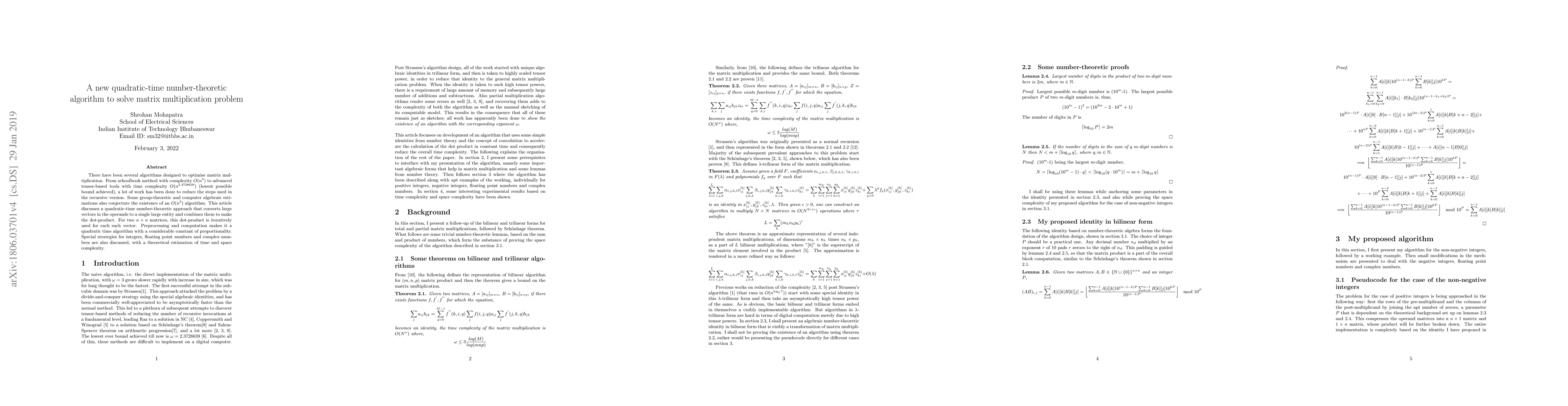 There have been several algorithms designed to optimise matrix multiplication. From schoolbook method with complexity $O(n^3)$ to advanced tensor-based tools with time complexity $O(n^{2.3728639})$ (lowest possible bound achieved), a lot of work has been done to reduce the steps used in the recursive version. Some group-theoretic and computer algebraic estimations also conjecture the existence of an $O(n^2)$ algorithm. This article discusses a quadratic-time number-theoretic approach that converts large vectors in the operands to a single large entity and combines them to make the dot-product. For two $n \times n$ matrices, this dot-product is iteratively used for each such vector. Preprocessing and computation makes it a quadratic time algorithm with a considerable constant of proportionality. Special strategies for integers, floating point numbers and complex numbers are also discussed, with a theoretical estimation of time and space complexity.