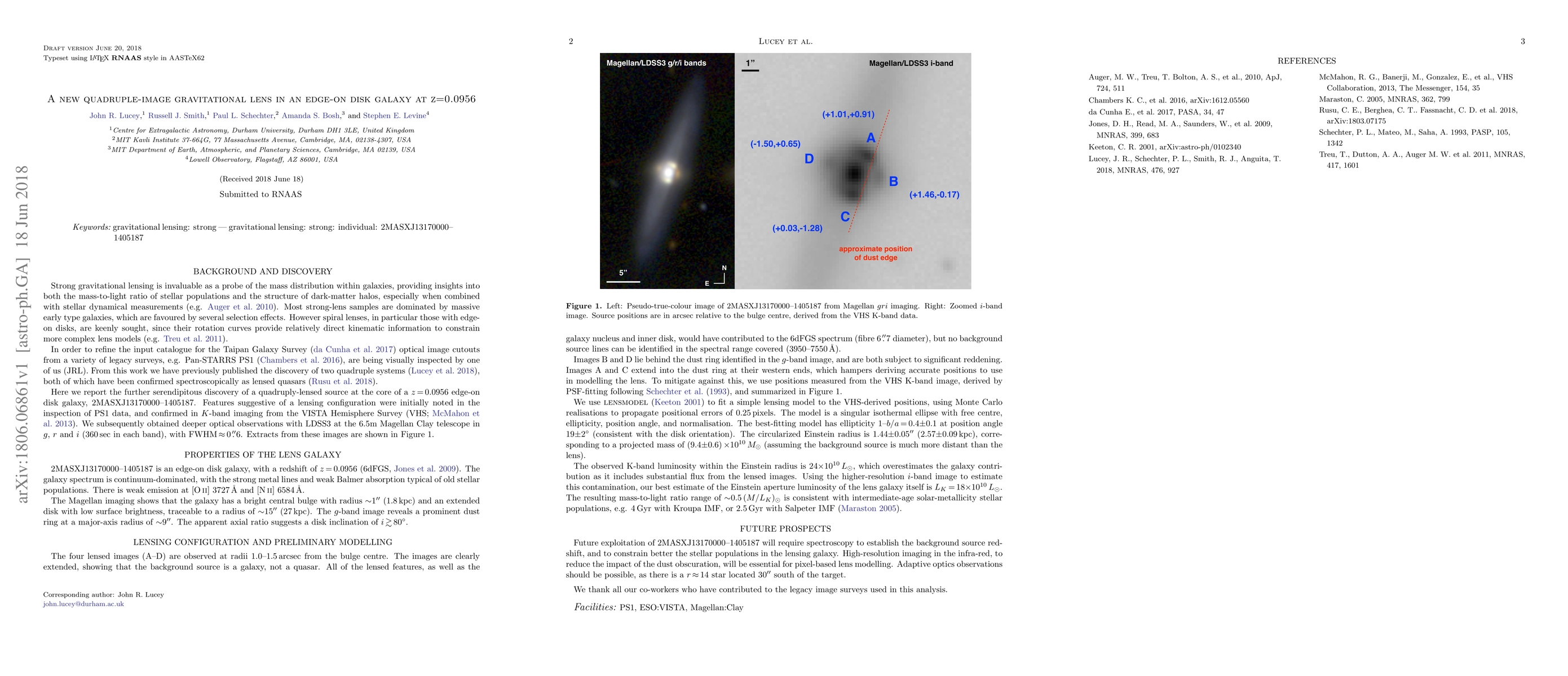 Summary: A quadruply-lensed source behind the edge-on disk galaxy 2MASXJ13170000-1405187 at z=0.0956 was discovered using Pan-STARRS and VISTA survey data, confirmed by Magellan/LDSS3 imaging. Preliminary modelling suggests an Einstein radius of 1.44 arcsec and a K-band mass-to-light ratio of 0.5.