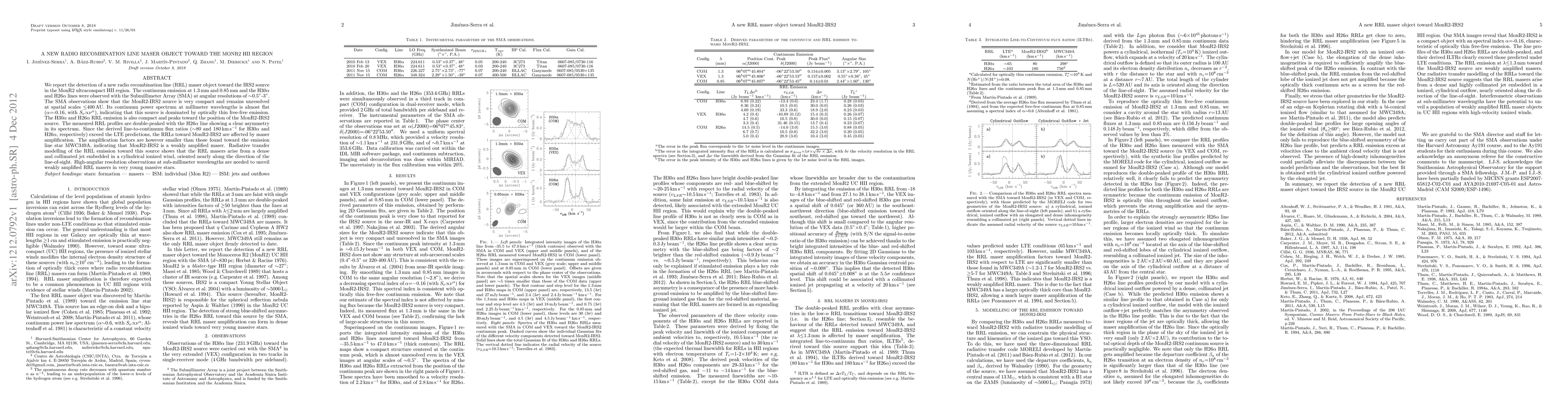 We report the detection of a new radio recombination line (RRL) maser object toward the IRS2 source in the MonR2 ultracompact HII region. The continuum emission at 1.3mm and 0.85mm and the H30a and H26a lines were observed with the Submillimeter Array (SMA) at angular resolutions of about 0.5"-3". The SMA observations show that the MonR2-IRS2 source is very compact and remains unresolved at spatial scales <=400AU. Its continuum power spectrum at millimeter wavelengths is almost flat (alpha=-0.16, with S_nu proportional to nu^alpha), indicating that this source is dominated by optically thin free-free emission. The H30a and H26a RRL emission is also compact and peaks toward the position of the MonR2-IRS2 source. The measured RRL profiles are double-peaked with the H26a line showing a clear asymmetry in its spectrum. Since the derived line-to-continuum flux ratios (80 and 180kms-1 for H30a and H26a, respectively) exceed the LTE predictions, the RRLs toward MonR2-IRS2 are affected by maser amplification. The amplification factors are however smaller than those found toward the emission line star MWC349A, indicating that MonR2-IRS2 is a weakly amplified maser. Radiative transfer modelling of the RRL emission toward this source shows that the RRL masers arise from a dense and collimated jet embedded in a cylindrical ionized wind, oriented nearly along the direction of the line-of-sight. High-angular resolution observations at sub-millimeter wavelengths are needed to unveil weakly amplified RRL masers in very young massive stars.