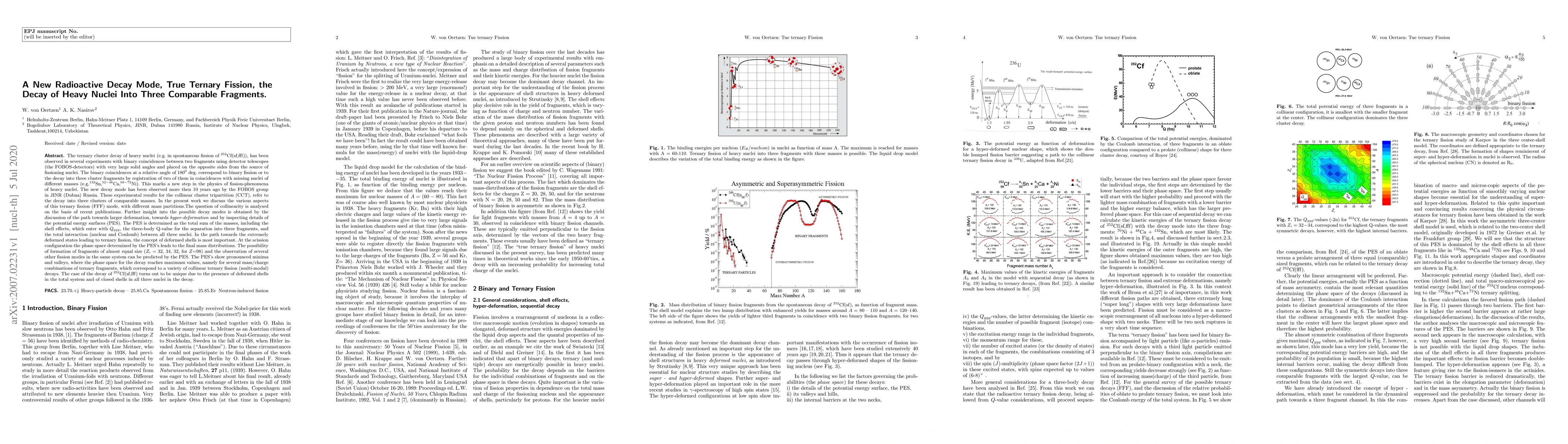 The ternary cluster decay of heavy nuclei has been observed in several experiments with binary coincidences between two fragments using detector telescopes (the FOBOS-detectors, JINR, Dubna) placed on the opposite sides from the source of fissioning nuclei. The binary coincidences at a relative angle of 180$^0$ deg. correspond to binary fission or to the decay into three cluster fragments by registration of two nuclei with different masses (e.g.$^{132}$Sn,$^{52-48}$Ca,$^{68-72}$Ni). This marks a new step in the physics of fission-phenomena of heavy nuclei. These experimental results for the collinear cluster tripartition (CCT), refer to the decay into three clusters of comparable masses. In the present work we discuss the various aspects of this ternary fission (FFF) mode. The question of collinearity is analysed on the basis of recent publications. Further insight into the possible decay modes is obtained by the discussion of the path towards larger deformation, towards hyper-deformation and by inspecting details of the potential energy surfaces (PES). In the path towards the extremely deformed states leading to ternary fission, the concept of deformed shells is most important. At the scission configuration the phase space determined by the PES's leads to the final mass distributions. The possibility of formation of fragments of almost equal size ($Z_i$ = 32, 34, 32, for $Z$=98) and the observation of several other fission modes in the same system can be predicted by the PES. The PES's show pronounced minima and valleys, namely for several mass/charge combinations of ternary fragments, which correspond to a variety of collinear ternary fission (multi-modal) decays. The case of the decay of $^{252}$Cf(sf,fff) turns out to be unique due to the presence of deformed shells in the total system and of closed shells in all three nuclei in the decay.