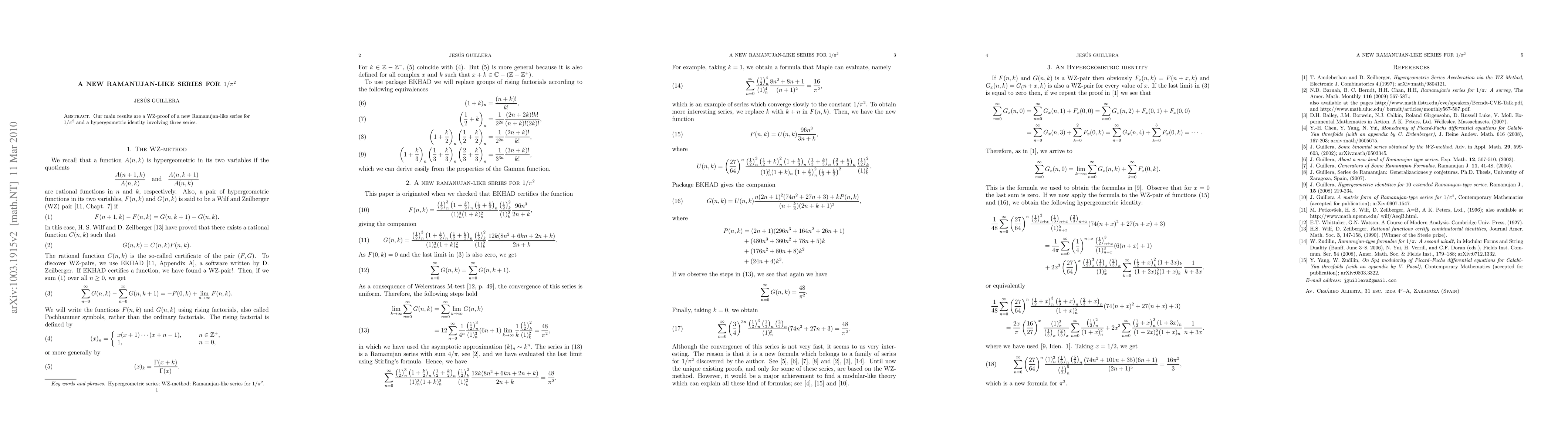 Our main results are a WZ-proof of a new Ramanujan-like series for $1/\pi^2$ and a hypergeometric identity involving three series.