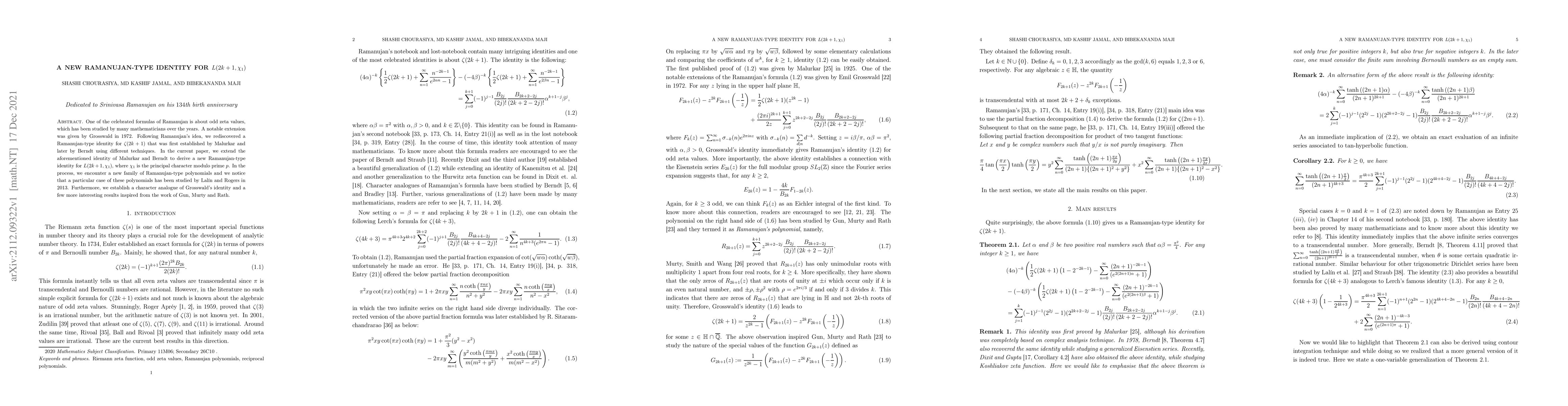 One of the celebrated formulas of Ramanujan is about odd zeta values, which has been studied by many mathematicians over the years. A notable extension was given by Grosswald in 1972. Following Ramanujan's idea, we rediscovered a Ramanujan-type identity for $\zeta(2k+1)$ that was first established by Malurkar and later by Berndt using different techniques. In the current paper, we extend the aforementioned identity of Malurkar and Berndt to derive a new Ramanujan-type identity for $L(2k+1, \chi_1)$, where $\chi_1$ is the principal character modulo prime $p$. In the process, we encounter a new family of Ramanujan-type polynomials and we notice that a particular case of these polynomials has been studied by Lal\'{i}n and Rogers in 2013. Furthermore, we establish a character analogue of Grosswald's identity and a few more interesting results inspired from the work of Gun, Murty and Rath.