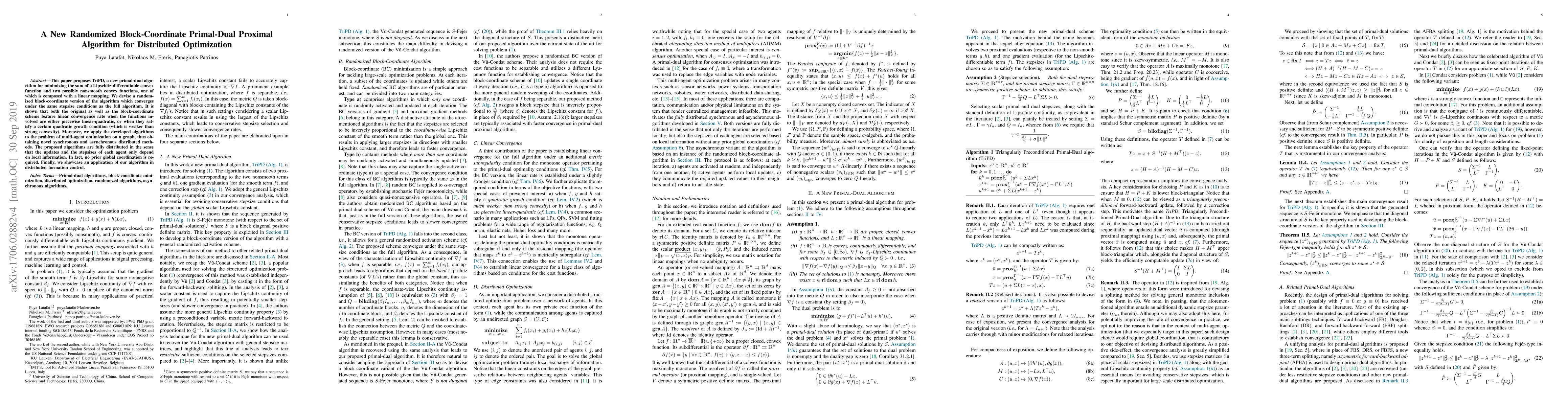 This paper introduces TriPD, a novel primal-dual algorithm for distributed optimization, featuring a randomized block-coordinate variant that converges linearly under specific conditions. The algorithm is applied to multi-agent optimization and distributed formation control, requiring no global coordination.