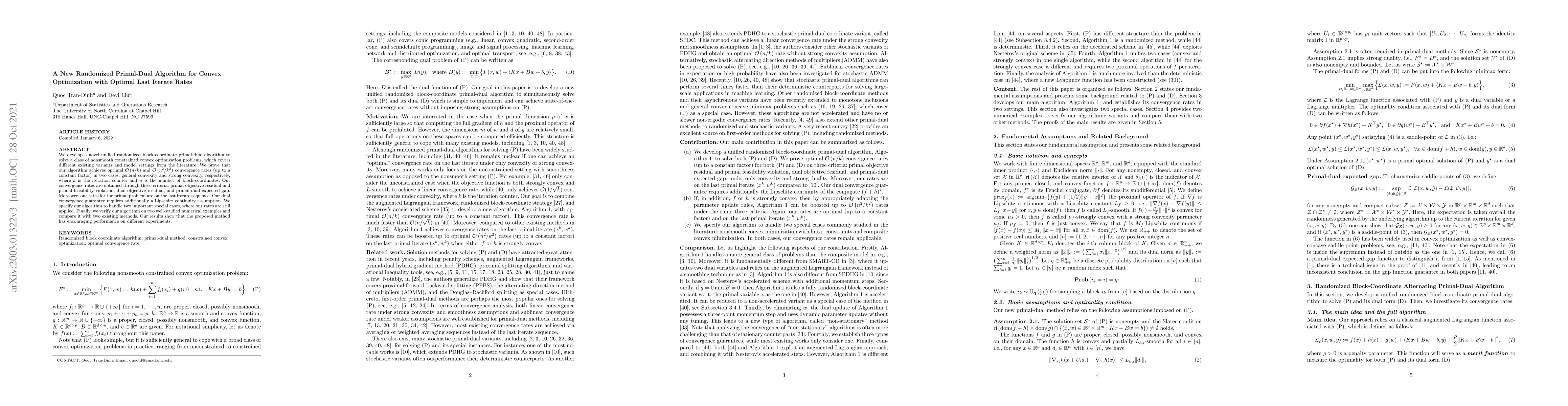 We develop a novel unified randomized block-coordinate primal-dual algorithm to solve a class of nonsmooth constrained convex optimization problems, which covers different existing variants and model settings from the literature. We prove that our algorithm achieves optimal $\mathcal{O}(n/k)$ and $\mathcal{O}(n^2/k^2)$ convergence rates (up to a constant factor) in two cases: general convexity and strong convexity, respectively, where $k$ is the iteration counter and n is the number of block-coordinates. Our convergence rates are obtained through three criteria: primal objective residual and primal feasibility violation, dual objective residual, and primal-dual expected gap. Moreover, our rates for the primal problem are on the last iterate sequence. Our dual convergence guarantee requires additionally a Lipschitz continuity assumption. We specify our algorithm to handle two important special cases, where our rates are still applied. Finally, we verify our algorithm on two well-studied numerical examples and compare it with two existing methods. Our results show that the proposed method has encouraging performance on different experiments.