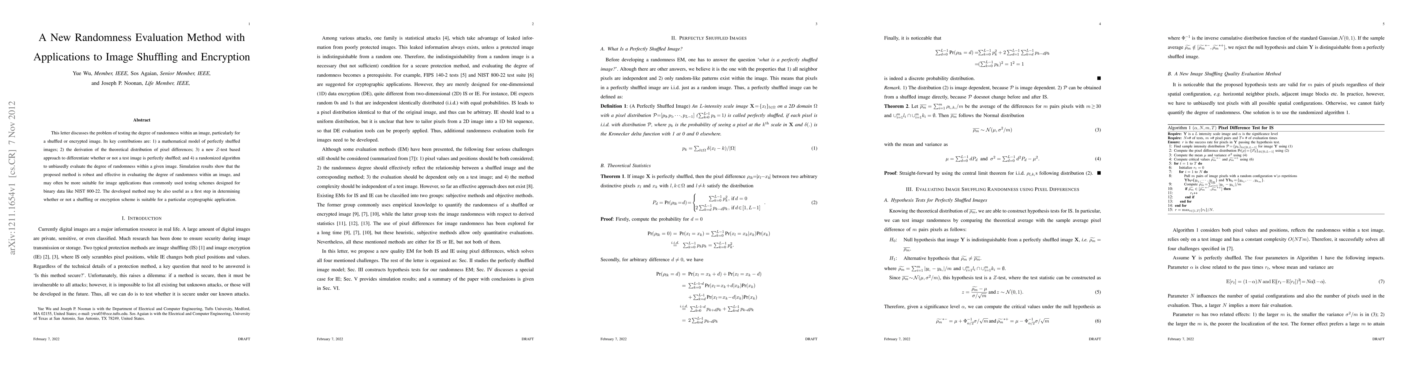 This letter discusses the problem of testing the degree of randomness within an image, particularly for a shuffled or encrypted image. Its key contributions are: 1) a mathematical model of perfectly shuffled images; 2) the derivation of the theoretical distribution of pixel differences; 3) a new $Z$-test based approach to differentiate whether or not a test image is perfectly shuffled; and 4) a randomized algorithm to unbiasedly evaluate the degree of randomness within a given image. Simulation results show that the proposed method is robust and effective in evaluating the degree of randomness within an image, and may often be more suitable for image applications than commonly used testing schemes designed for binary data like NIST 800-22. The developed method may be also useful as a first step in determining whether or not a shuffling or encryption scheme is suitable for a particular cryptographic application.