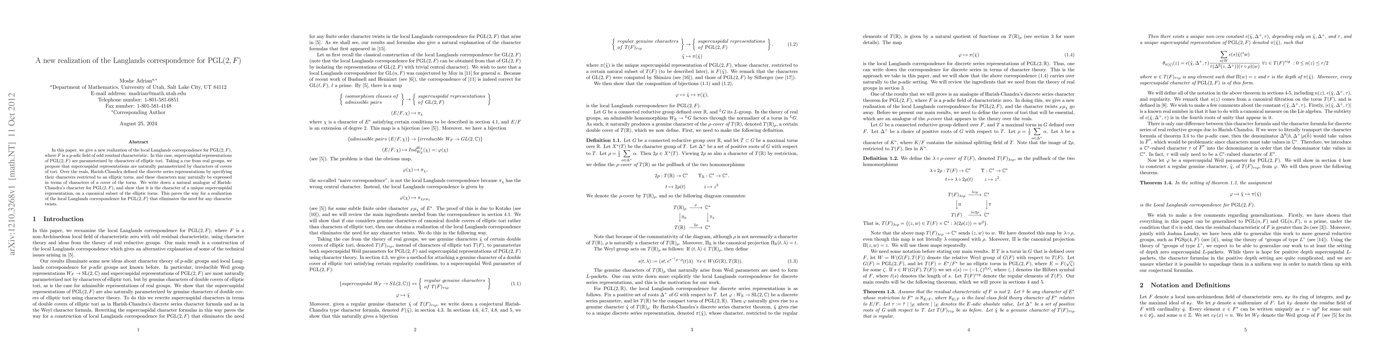 In this paper, we give a new realization of the local Langlands correspondence for PGL(2,F), where F is a p-adic field of odd residual characteristic. In this case, supercuspidal representations of PGL(2,F) are parameterized by characters of elliptic tori. Taking a cue from real groups, we propose that supercuspidal representations are naturally parameterized by characters of covers of tori. Over the reals, Harish-Chandra defined the discrete series representations by specifying their characters restricted to an elliptic torus, and these characters may naturally be expressed in terms of characters of a cover of the torus. We write down a natural analogue of Harish-Chandra's character for PGL(2,F), and show that it is the character of a unique supercuspidal representation, on a canonical subset of the elliptic torus. This paves the way for a realization of the local Langlands correspondence for PGL(2,F) that eliminates the need for any character twists.