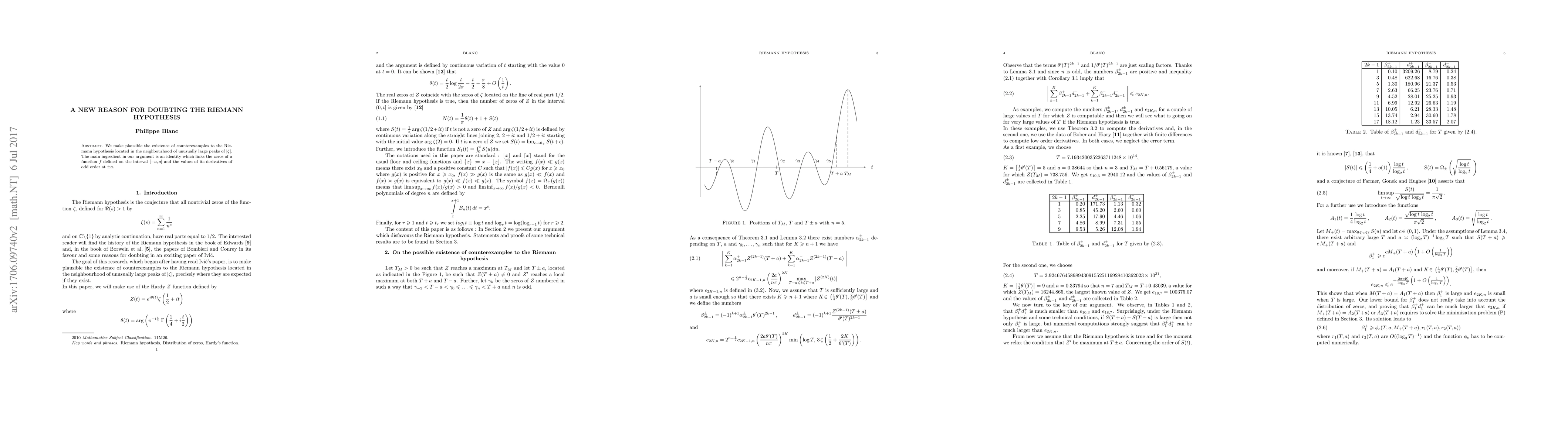 We make plausible the existence of counterexamples to the Riemann hypothesis located in the neighbourhood of unusually large peaks of $\vert \zeta \vert$. The main ingredient in our argument is an identity which links the zeros of a function $f$ defined on the interval $[-a,a]$ and the values of its derivatives of odd order at $\pm a$.