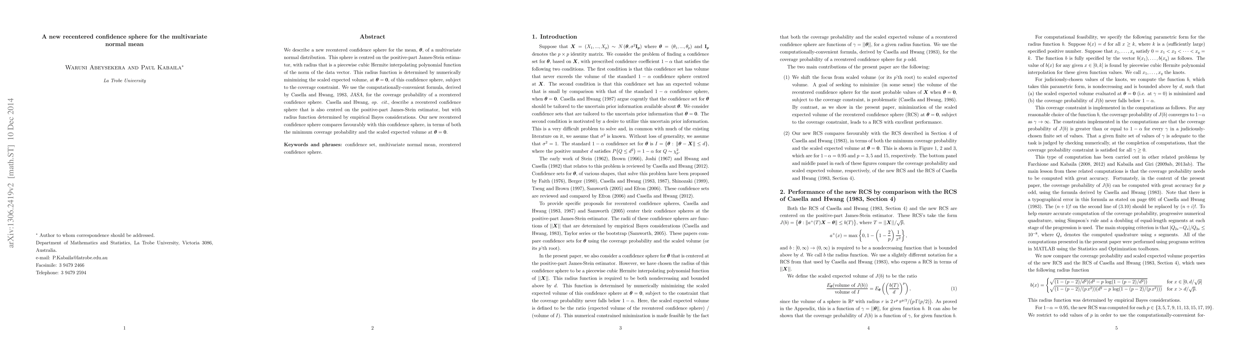 We describe a new recentered confidence sphere for the mean, theta, of a multivariate normal distribution. This sphere is centred on the positive-part James-Stein estimator, with radius that is a piecewise cubic Hermite interpolating polynomial function of the norm of the data vector. This radius function is determined by numerically minimizing the scaled expected volume, at theta = 0, of this confidence sphere, subject to the coverage constraint. We use the computationally-convenient formula, derived by Casella and Hwang [3], for the coverage probability of a recentered confidence sphere. Casella and Hwang, op. cit., describe a recentered confidence sphere that is also centred on the positive-part James-Stein estimator, but with radius function determined by empirical Bayes considerations. Our new recentered confidence sphere compares favourably with this confidence sphere, in terms of both the minimum coverage probability and the scaled expected volume at theta = 0.