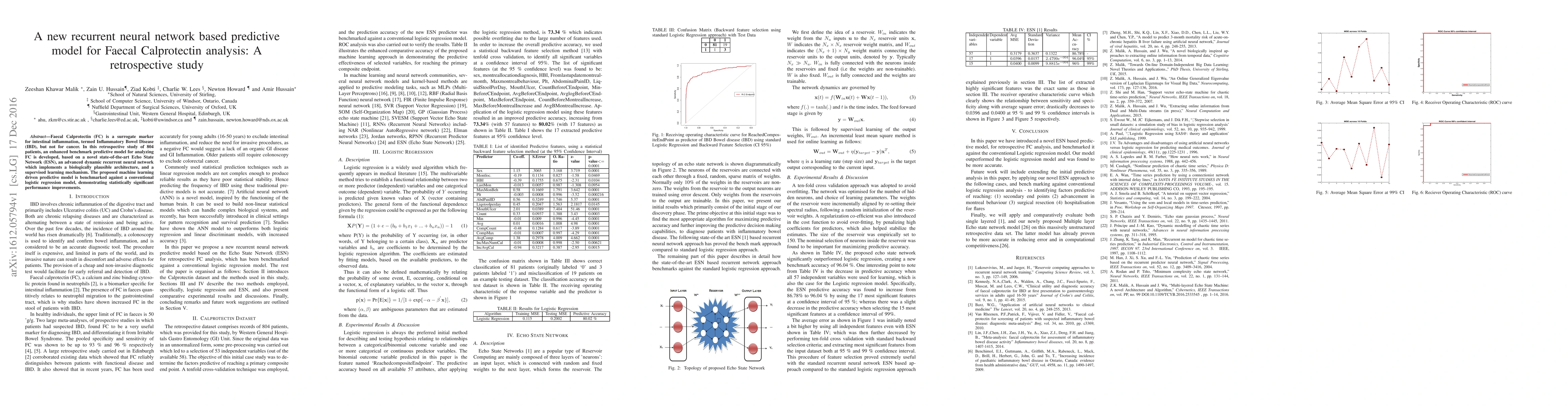 Faecal Calprotectin (FC) is a surrogate marker for intestinal inflammation, termed Inflammatory Bowel Disease (IBD), but not for cancer. In this retrospective study of 804 patients, an enhanced benchmark predictive model for analyzing FC is developed, based on a novel state-of-the-art Echo State Network (ESN), an advanced dynamic recurrent neural network which implements a biologically plausible architecture, and a supervised learning mechanism. The proposed machine learning driven predictive model is benchmarked against a conventional logistic regression model, demonstrating statistically significant performance improvements.