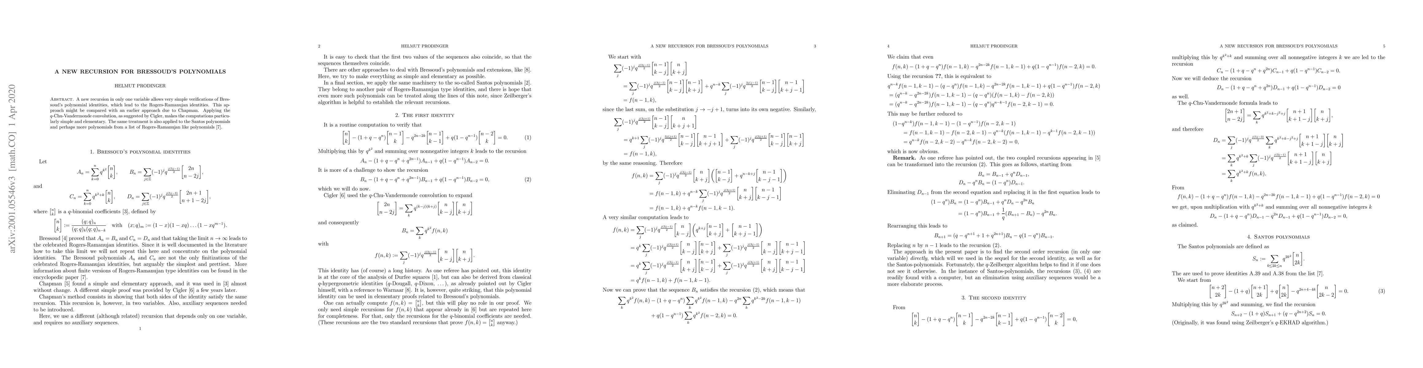 Researchers discovered a new recursion for Bressoud's polynomials that simplifies verification of Rogers-Ramanujan identities through the q-Chu-Vandermonde convolution.