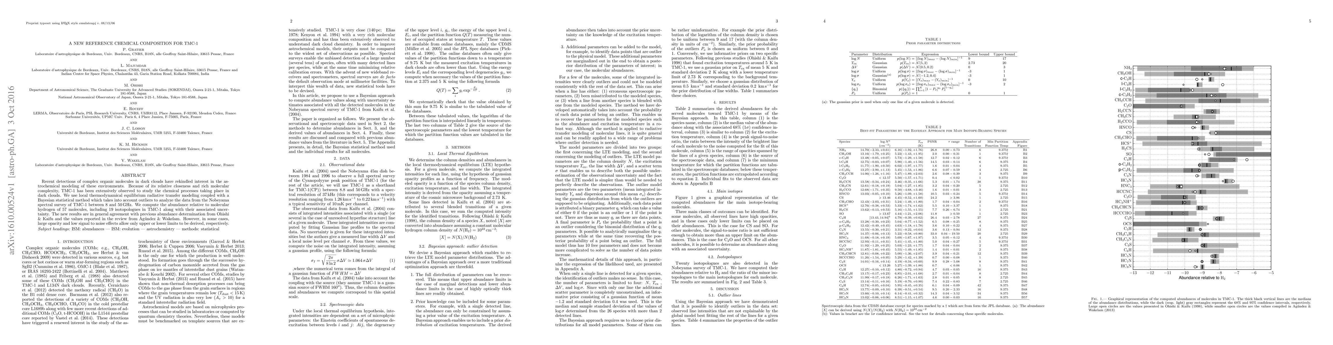 Recent detections of complex organic molecules in dark clouds have rekindled interest in the astrochemical modeling of these environments. Because of its relative closeness and rich molecular complexity, TMC-1 has been extensively observed to study the chemical processes taking place in dark clouds. We use local thermodynamical equilibrium radiative transfer modeling coupled with a Bayesian statistical method which takes into account outliers to analyze the data from the Nobeyama spectral survey of TMC-1 between 8 and 50 GHz. We compute the abundance relative to molecular hydrogen of 57 molecules, including 19 isotopologues in TMC-1 along with their associated uncertainty. The new results are in general agreement with previous abundance determination from Ohishi & Kaifu and the values reported in the review from Agundez & Wakelam. However, in some cases, large opacity and low signal to noise effects allow only upper or lower limits to be derived, respectively.