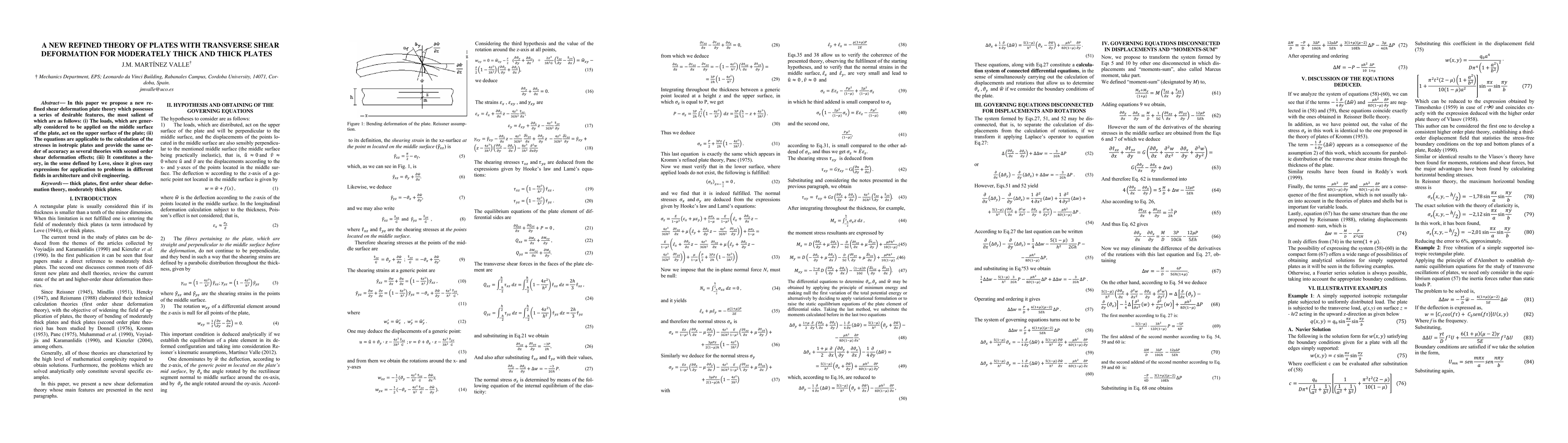 In this paper we propose a new refined shear deformation plate theory which possesses a series of desirable features, the most salient of which are as follows: (i) The loads, which are generally considered to be applied on the middle surface of the plate, act on the upper surface of the plate; (ii) The equations are applicable to the calculation of the stresses in isotropic plates and provide the same order of accuracy as several theories with second order shear deformation effects; (iii) It constitutes a theory, in the sense defined by Love, since it gives easy expressions for application to problems in different fields in architecture and civil engineering