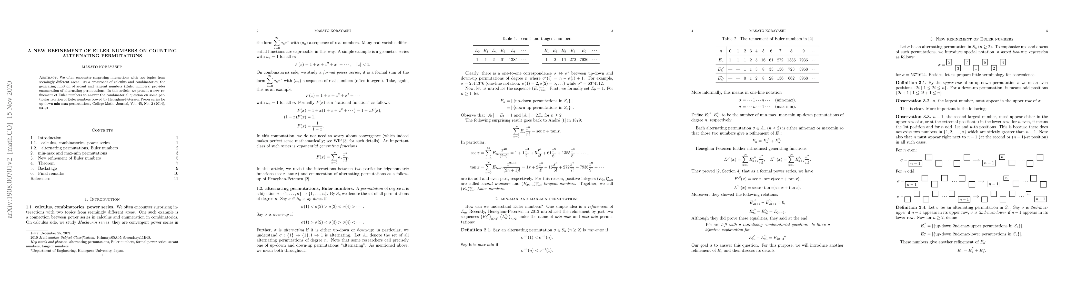 At a crossroads of calculus and combinatorics, the generating function of secant and tangent numbers (Euler numbers) provides enumeration of alternating permutations. In this article, we present a new refinement of Euler numbers to answer the combinatorial question on some particular relation of Euler numbers proved by Heneghan-Petersen, Power series for up-down min-max permutations, College Math. Journal, Vol. 45, No. 2 (2014), 83-91.