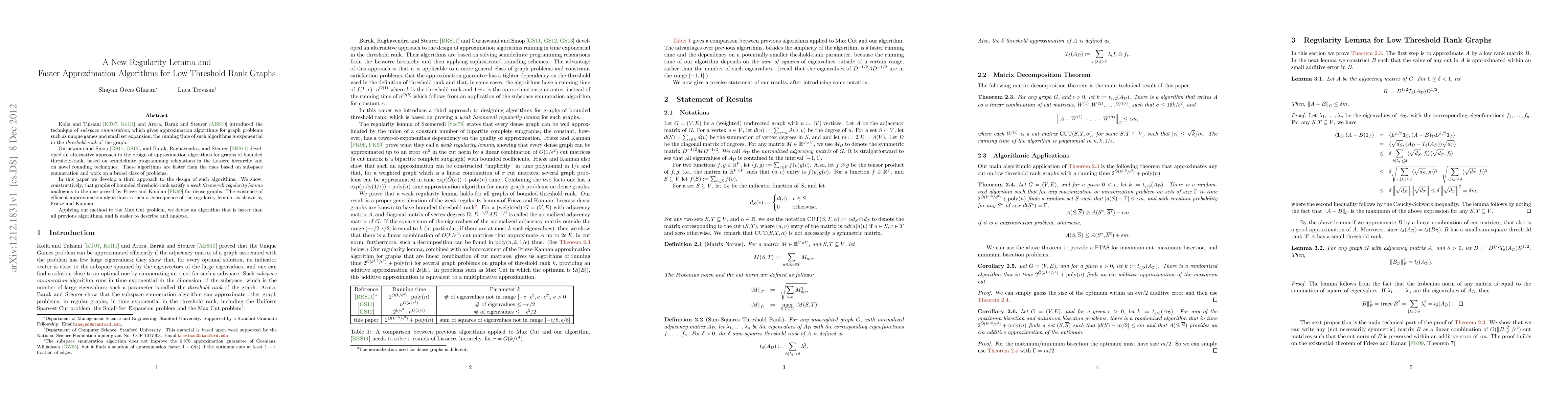 Kolla and Tulsiani [KT07,Kolla11} and Arora, Barak and Steurer [ABS10] introduced the technique of subspace enumeration, which gives approximation algorithms for graph problems such as unique games and small set expansion; the running time of such algorithms is exponential in the threshold-rank of the graph. Guruswami and Sinop [GS11,GS12], and Barak, Raghavendra, and Steurer [BRS11] developed an alternative approach to the design of approximation algorithms for graphs of bounded threshold-rank, based on semidefinite programming relaxations in the Lassere hierarchy and on novel rounding techniques. These algorithms are faster than the ones based on subspace enumeration and work on a broad class of problems. In this paper we develop a third approach to the design of such algorithms. We show, constructively, that graphs of bounded threshold-rank satisfy a weak Szemeredi regularity lemma analogous to the one proved by Frieze and Kannan [FK99] for dense graphs. The existence of efficient approximation algorithms is then a consequence of the regularity lemma, as shown by Frieze and Kannan. Applying our method to the Max Cut problem, we devise an algorithm that is faster than all previous algorithms, and is easier to describe and analyze.