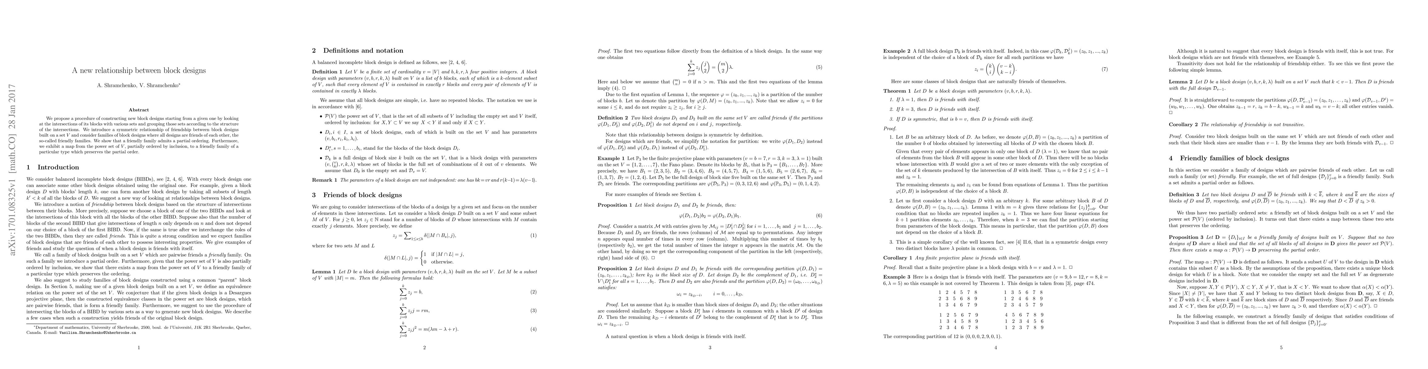 This paper proposes a method to construct new block designs from existing ones by examining intersections of blocks with various sets, introducing a symmetric "friendship" relationship among block designs. It defines "friendly families" of block designs and demonstrates a partial ordering within these families, along with a mapping preserving the partial order from the power set of a set $V$.