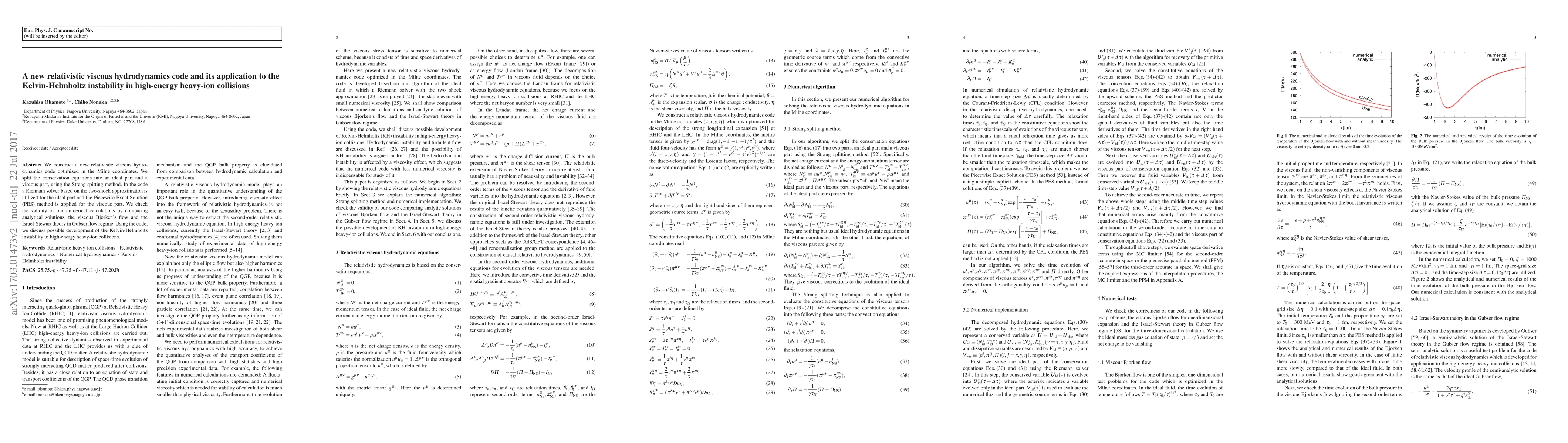 This paper introduces a new relativistic viscous hydrodynamics code optimized for Milne coordinates, employing a Strang splitting method and Riemann solvers for conservation equations. The code is validated against analytical solutions and applied to study the Kelvin-Helmholtz instability in high-energy heavy-ion collisions.